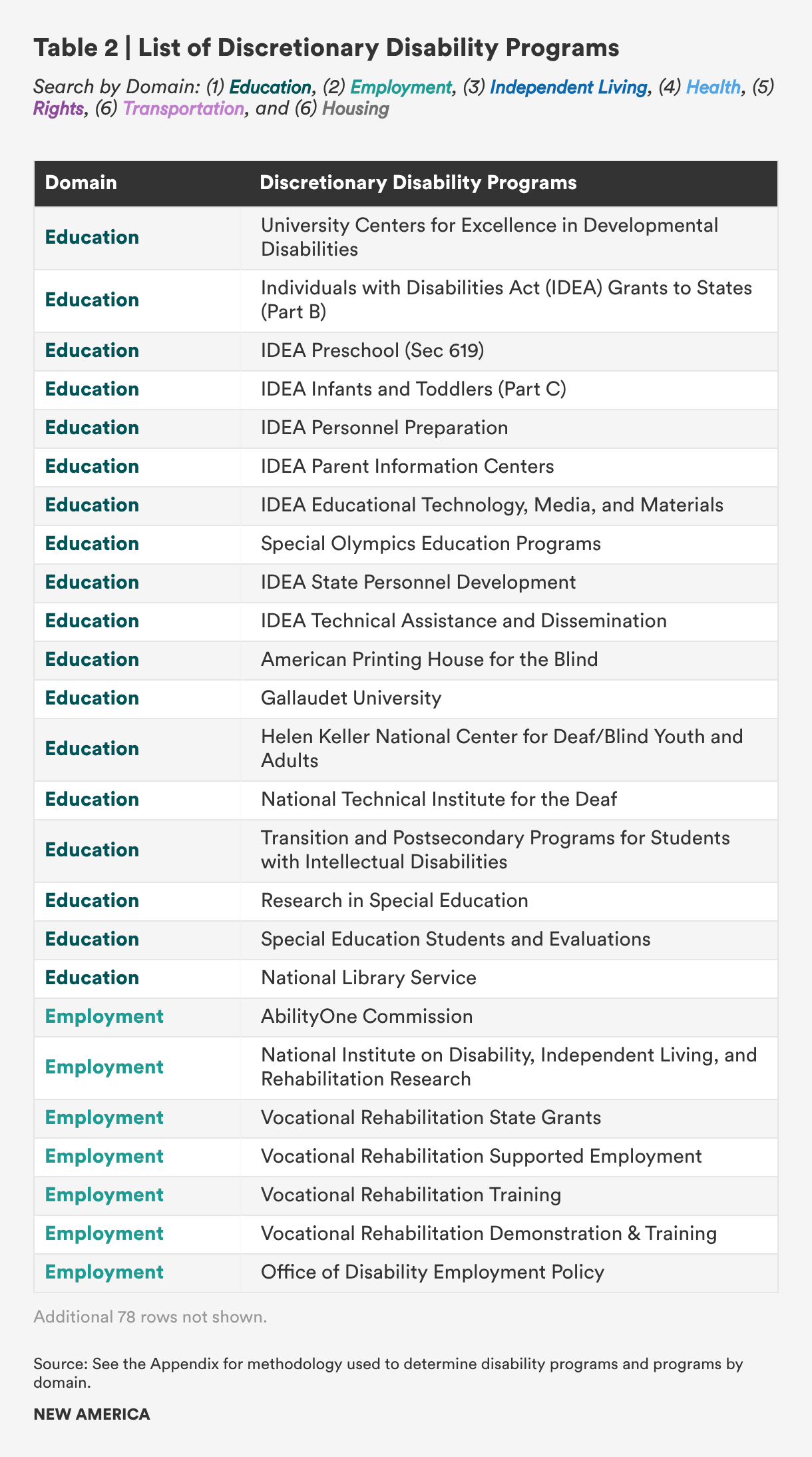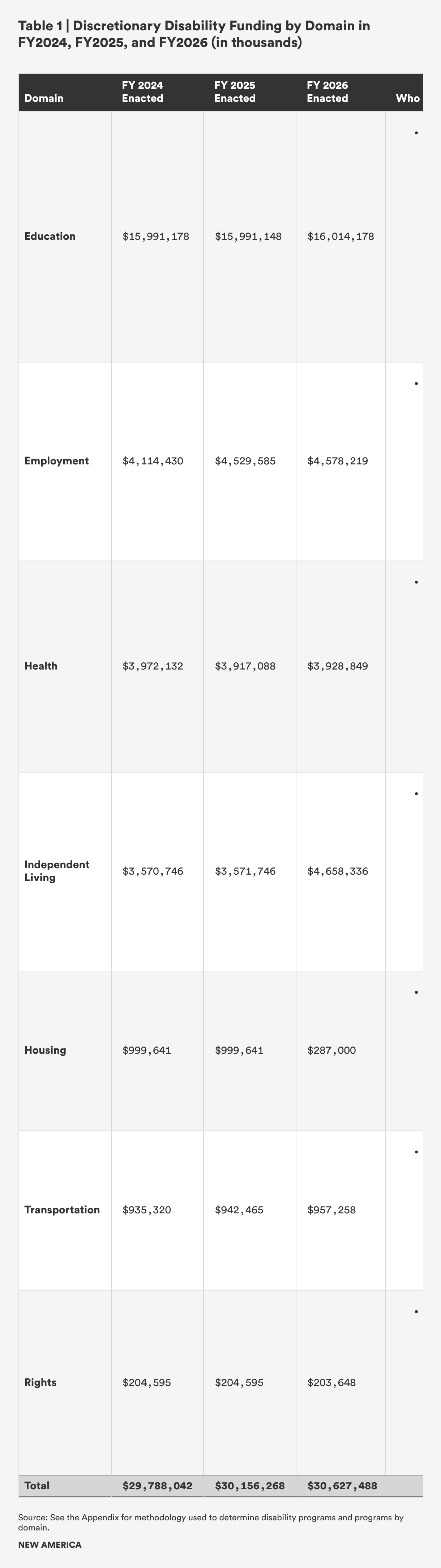 Discretionary disability programs support seven domains: education, employment, health, housing, independent living, rights, and transportation. The author examined federal appropriations over the last three fiscal years to identify disability-specific programs. Table 1 shows funding for each domain for FY 2024, FY 2025, and FY 2026. Within each domain, minimal increases have occurred with primarily flat funding. In FY 2024 and FY 2025, the federal government provided roughly $29.8 billion and $30.15 billion for discretionary disability support programs, respectively. The FY 2026 appropriations bills provide about $30.6 billion, or a 1.6 percent increase for disability programs (See Appendix for methodology.)