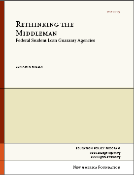 Guaranty agencies’ subsidies, responsibilities, and relationships are better suited for a different era of federal student aid policy. Their outdated roles and relationships with lenders not only undermine the underlying policy goals of the original student loan program, they lead to inefficient uses of taxpayer dollars and a variety of practices that harm rather than help student borrowers. Today, the New America Foundation is releasing “Rethinking the Middleman,” a report that explores the history and policy shortcomings of guaranty agencies and provides reform recommendations to Congress and the U.S. Department of Education.