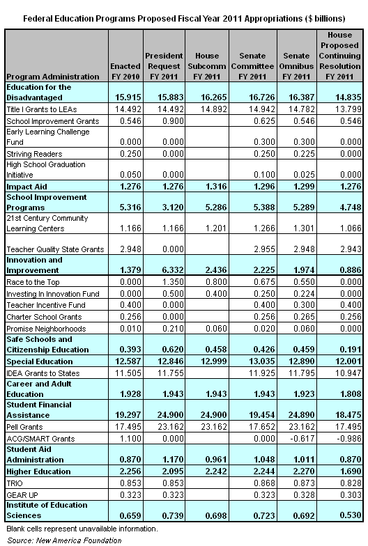 This new CR, which looks likely to pass the House by the end of this week, makes several changes to existing education funding. According to bill text and other supplemental documentation provided by the Appropriations Committee, it cuts $693 million from Title I, Part A grants to local education agencies from 2010 levels and $493 million from Innovation and Improvement programs. The original version of the bill also cut $557 million from Individuals with Disabilities Education Act grants to states but the House recently passed an amendment that would restore this funding and offset it with cuts from Title I School Improvement Grants and Improving Teacher Quality State Grants. Only a few programs are not slated for cuts from 2010 levels in the bill including Pell Grants, which would be funded at $17.5 billion (This is only enough to provide a maximum grant of $4,705, down from the current maximum grant level of $5,550.), and Impact Aid, which would be funded at $1.3 billion. The bill provides no funding for Race to the Top or Investing in Innovation, two of the Obama administration’s favored programs.