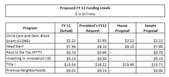 The House appropriations bill zeros out funding for some of the President’s hallmark programs, including Race to the Top (RTTT) and Investing in Innovation (i3). The Senate proposal, however, holds both funding levels steady at fiscal year 2011 levels. The President had requested an increase in funding for each program. The House proposal also excludes funding for the Promise Neighborhoods program, ignoring the President’s request for a substantial increase.