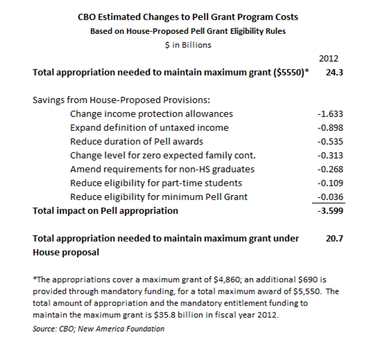 As we wrote earlier this week, the House Appropriations Committee’s Labor-HHS-Education Appropriations bill for fiscal year 2012 makes numerous changes to eligibility rules for the Pell Grant program. These changes lower the cost of the program by $3.6 billion in 2012, meaning Congress needs to the fund the program at only $20.7 billion to maintain the maximum grant of $5,550 for the 2012-2013 school year. That’s down $2.3 billion from 2011 levels. Naturally, some of the eligibility changes affect the cost of the program more than others. According to a preliminary Congressional Budget Office (CBO) estimate, however, the changes that lower the cost of the program the most are surprising.