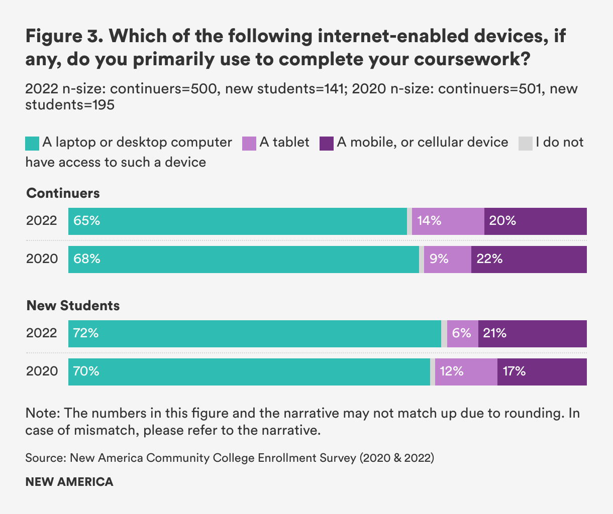 The past three years have highlighted the internet and device barriers that students encounter when completing their education. Findings from this survey suggest that many students have access to high-speed internet but the quality of these services is not suitable for connecting to online courses. With online learning not leaving college campuses anytime soon, student success hinges on having stable access to internet and other technology. These findings indicate that the availability of institutional, state, and federal assistance does not mean students are accessing them and that policymakers and researchers must consider how to address this ongoing gap once pandemic-era programs expire.