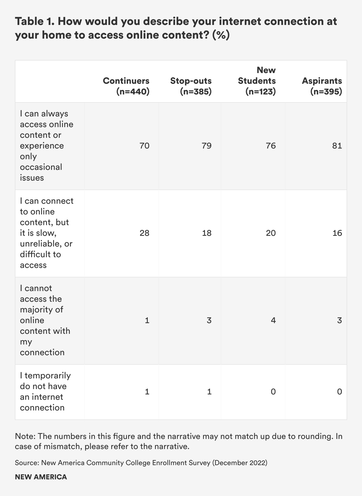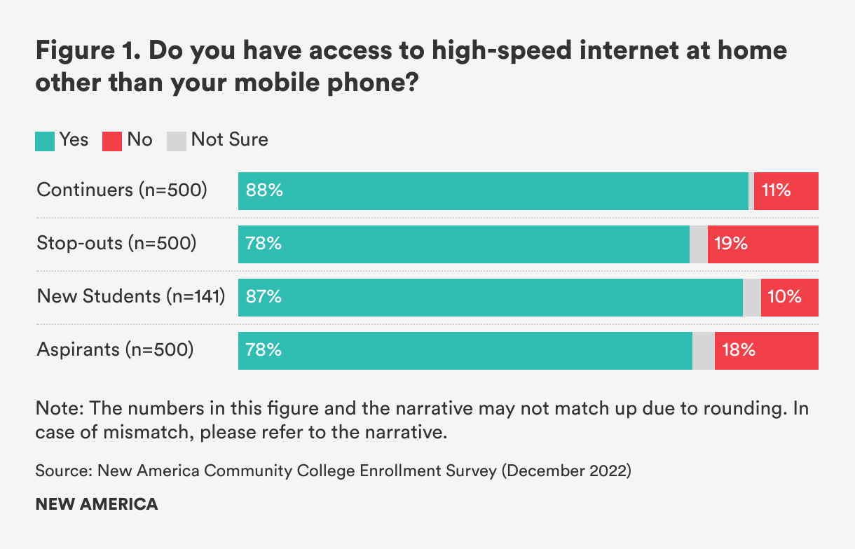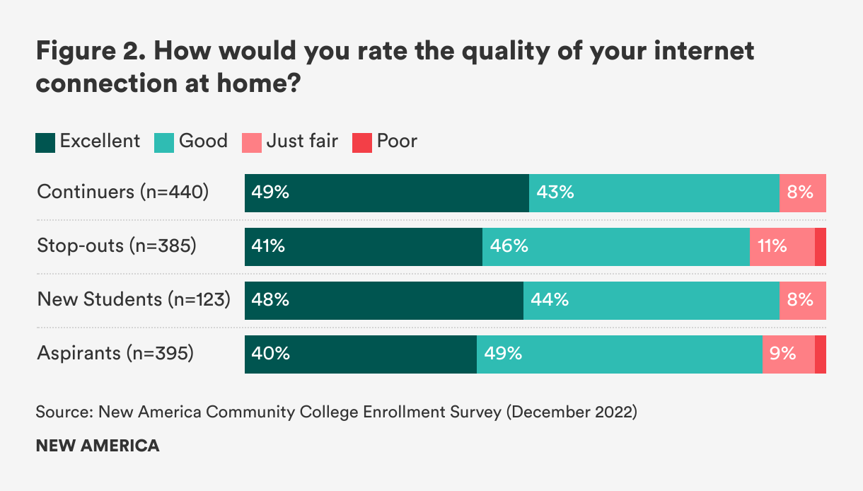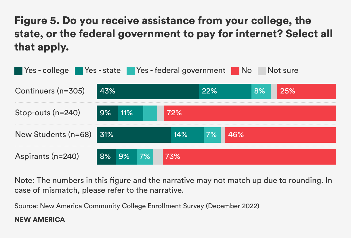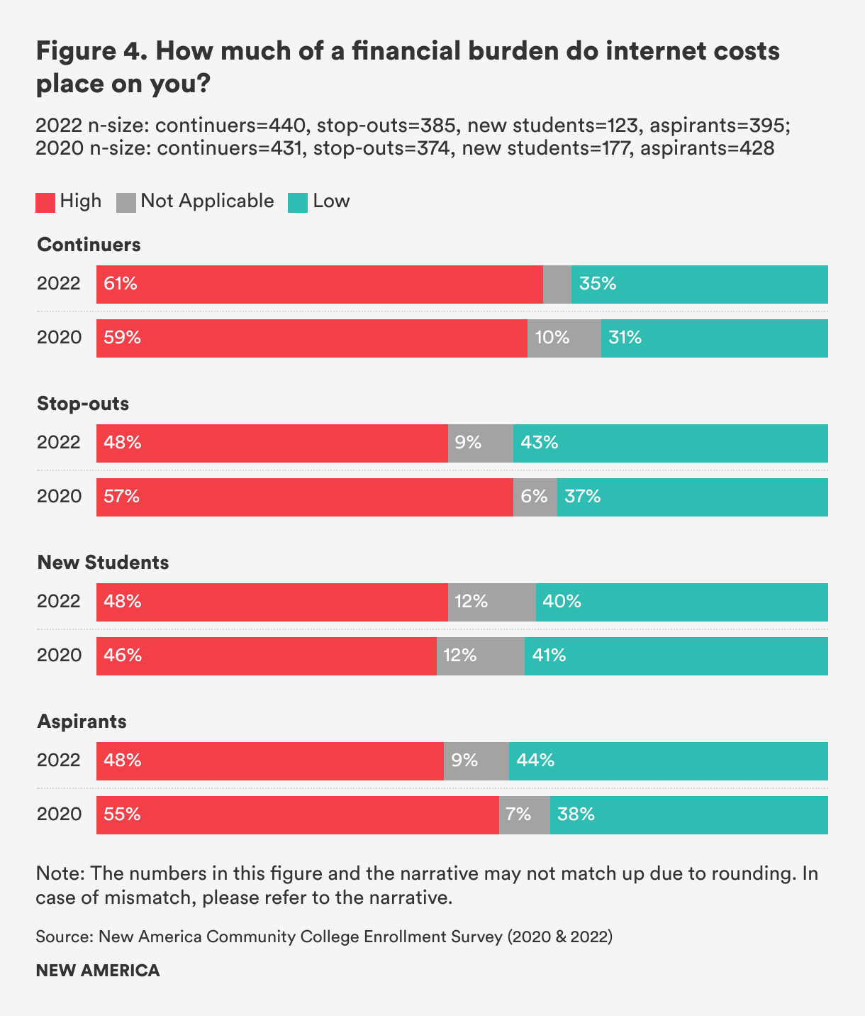 Despite these federal programs committed to providing internet and technology assistance, roughly half of all respondents (61 percent of continuers, 48 percent of stop-outs, 48 percent of new students, and 48 percent of aspirants) with access to high-speed internet indicated that internet access is a high financial burden. This number has remained largely unchanged for continuers (59 percent) and new students (46 percent) since we asked them this question two years ago (see Figure 4).