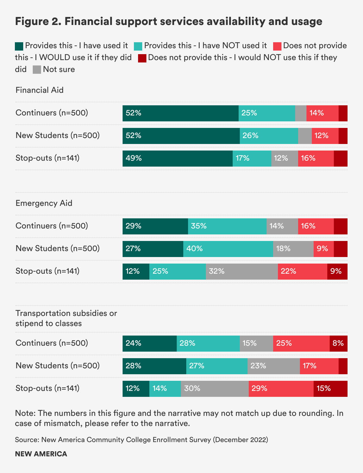 Financial support, including financial aid, emergency aid, and transportation stipends, provides a stimulus to get students enrolled and helps them get to the finish line. Our findings show that financial aid that students can use towards tuition and living expenses unsurprisingly remains the most common type of financial support available to students, compared to emergency aid and transportation stipends. Nearly 80 percent of both continuers and new students said that their colleges offered financial aid, while only 64 percent of continuers and 67 percent of new students said emergency aid is available at their colleges, and only over half of continuers (52 percent) and new students (55 percent) said transportation stipends are available (See Figure 2).
