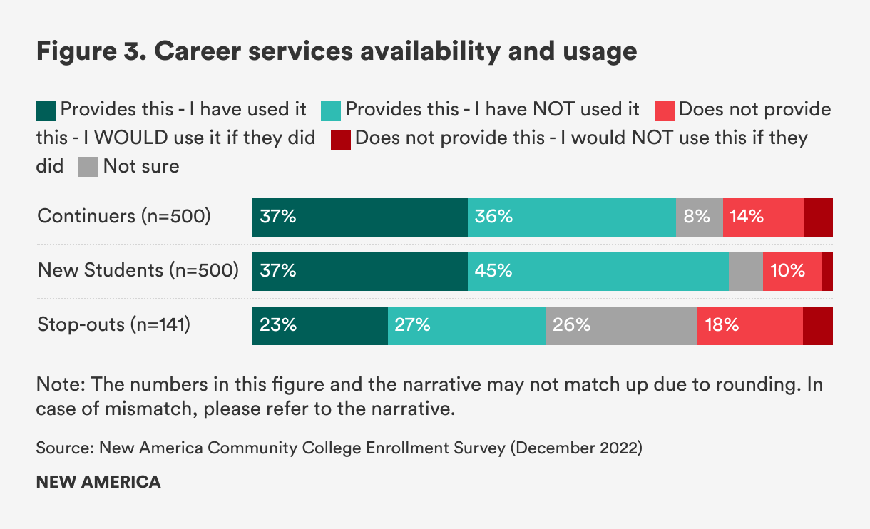 Career services are well-known among current community college students. More than 70 and 80 percent of continuers and new students respectively said that their colleges provide career services (See Figure 3). More than a third of continuers and nearly half of new students said they have used this resource. But among stop-outs, only half said their former colleges offered career services and one in four was unsure whether these services were available. Only 23 percent of stop-outs have used career services offered at their former colleges.