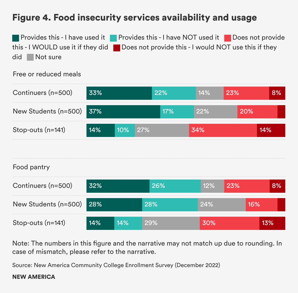 Majorities of continuers (55 percent) and new students (54 percent) reported their college provided free or reduced meals to students, and around one-third of continuers (33 percent) and new students (37 percent) had utilized this service (See Figure 4). Only one in four stop-outs said their colleges provided free or reduced meals to students, but 34 percent of stop-outs stated that they would have used this program if their institution had offered it. A similar trend emerges when considering on-campus food pantries: 57 percent of continuers, 56 percent of new students, and 28 percent of stop-outs reported this service availability at their institution.