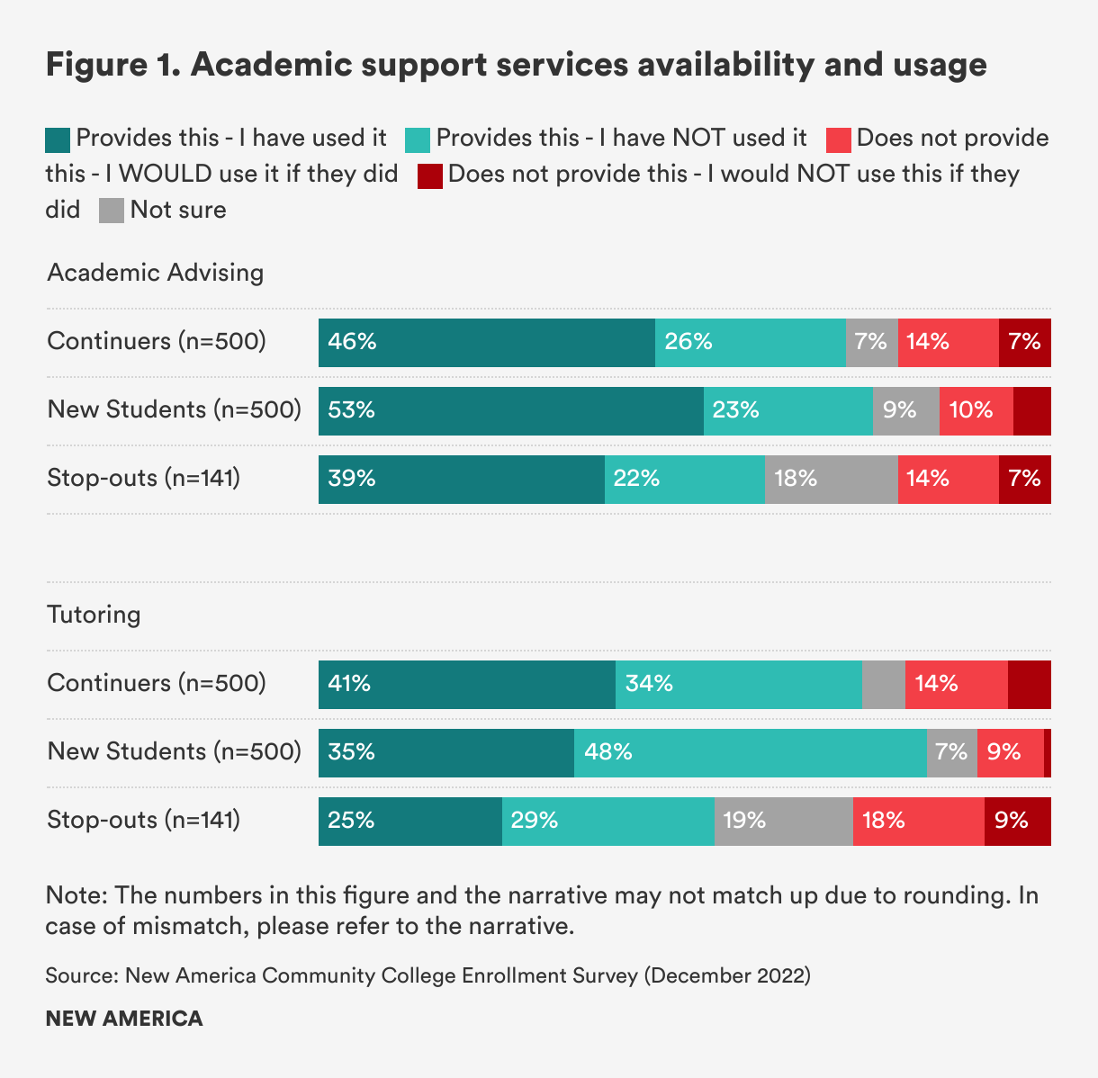 [1] Our survey looks into four groups of students at community college: “continuers,” who enrolled between January 2021 and 2022 and continued enrollment in fall of 2022, “stop-outs,” who enrolled between spring 2021 and 2022 and are no longer enrolled, “new students,” who considered enrolling earlier in the year and enrolled in the fall 2022, and “aspirants,” who considered enrolling earlier in the year and are not currently enrolled.