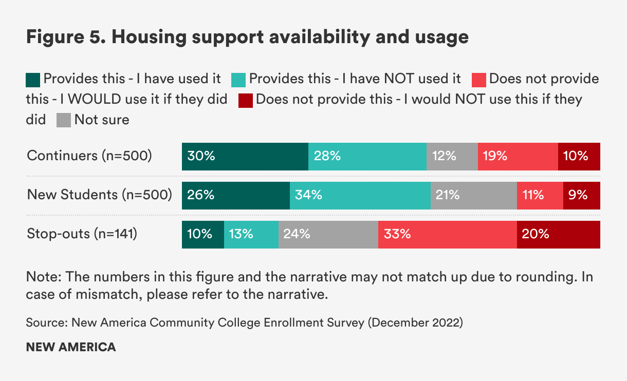 Approximately six in ten continuers and new students shared that their college offered housing support, compared with less than one-fourth of stop-outs (23 percent) (See Figure 5). Three in ten continuers, 26 percent of new students, and just 10 percent of stop-outs accepted housing support from their college while in school.
