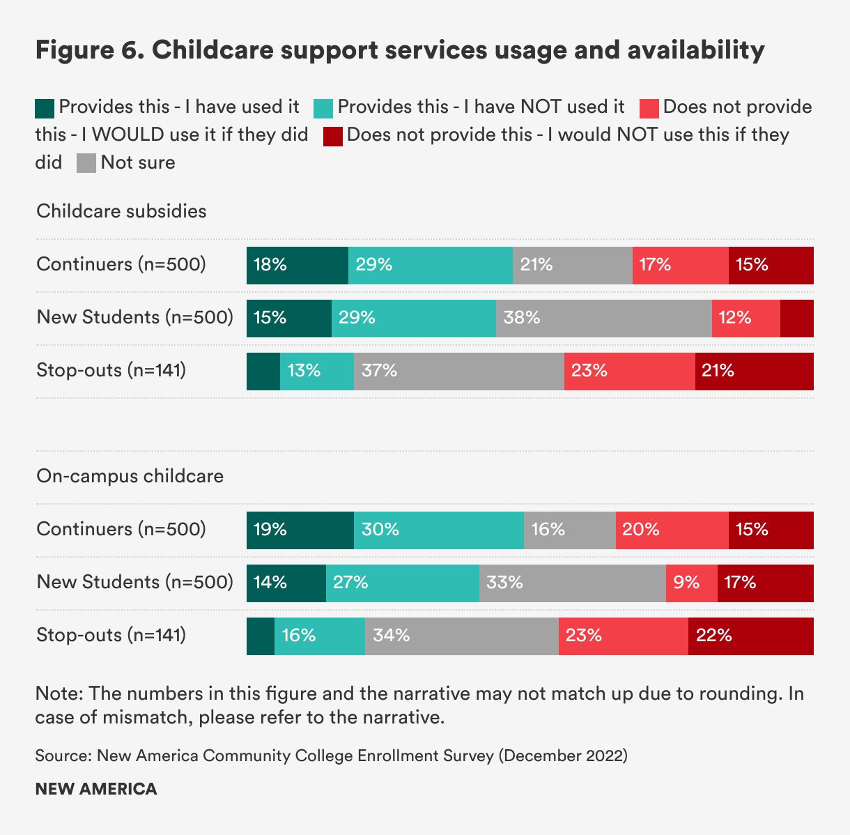 When considering childcare, 47 percent of continuers and 44 percent of new students were aware that their college offered childcare subsidies, and nearly half (49 percent) of continuers and 41 percent of new students were aware that their institution provided on-campus childcare (See Figure 6). But only one-fifth of stop-outs shared that their college offered childcare subsidies and on-campus childcare. Nearly one in four (23 percent) stop-outs report that they would have used these services if they knew they had the opportunity.