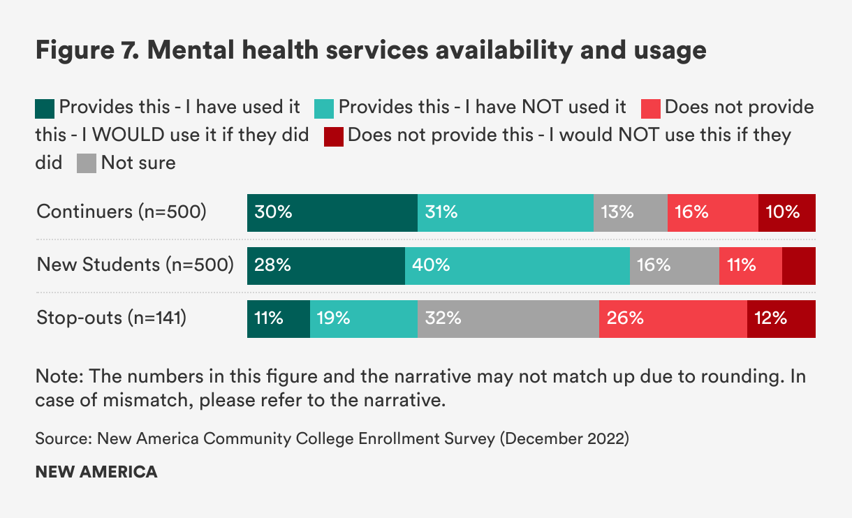 Last but not least, over six in ten continuers (61 percent) and new students (67 percent) report that their college provides mental health services (See Figure 7). Three in ten continuers and 28 percent of new students have utilized these services, and an additional 16 percent of continuers and 11 percent of new students express that they would use these services if they were provided by their institution. As seen in other support areas, a significantly lower proportion of stop-outs (29 percent) express familiarity with these services on their former college campuses. Just 11 percent of stop-outs utilized mental healthcare through their institution, but a notable 26 percent expressed that they would have used such services if they had been offered them. Stop-outs who are women of color are even more likely to state that they would have used this service if provided: 32 percent of Black women and 36 percent of Latinx women say so, compared to 24 percent of white women.