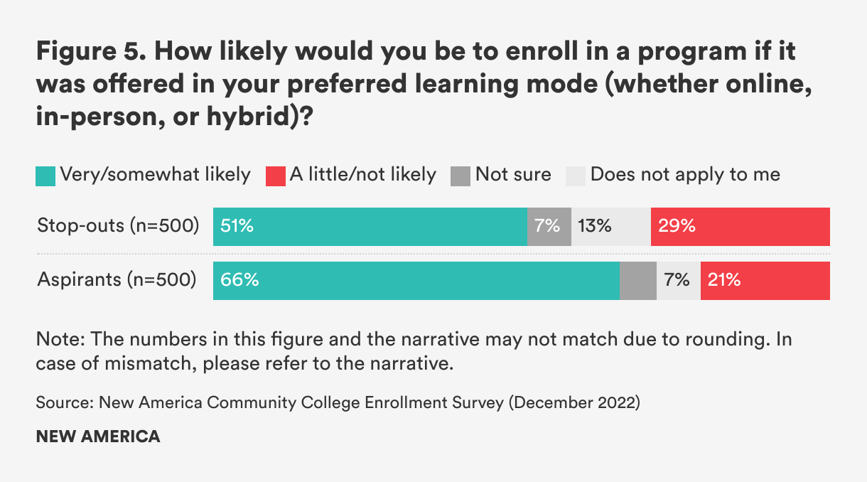 Learning modality (whether fully in-person, hybrid, or fully online) plays a role in students’ decision to enroll. Among those who did not enroll in fall 2022, roughly a third of stop-outs (30 percent) and aspirants (36 percent) said they did not want to take classes in the new learning mode of the program. When we asked stops-out and aspirants what would make them more likely to enroll in the future, we found that a majority of stop-outs (51 percent) and aspirants (66 percent) would be more likely to enroll in a program if it were offered in their preferred learning mode (See Figure 5).