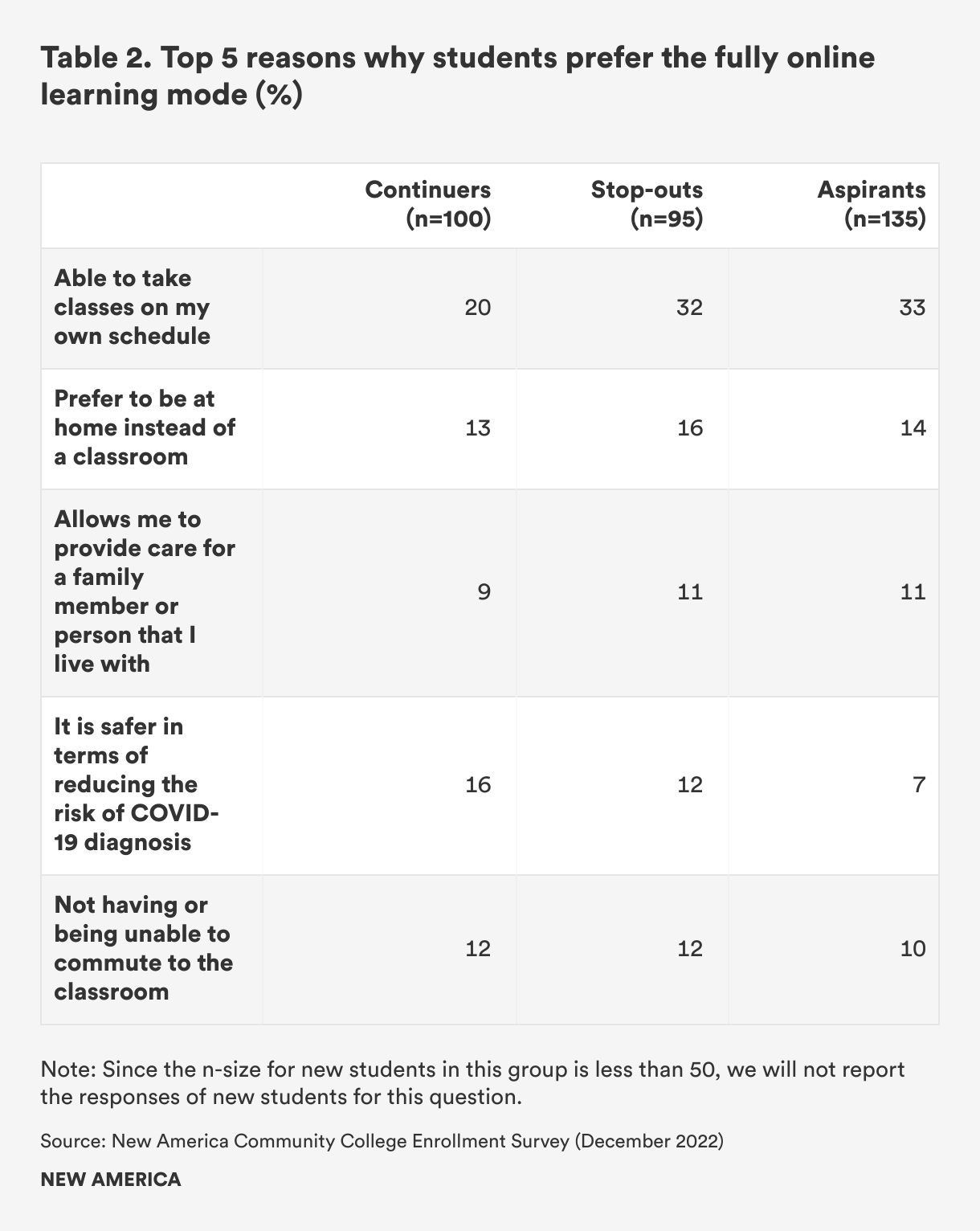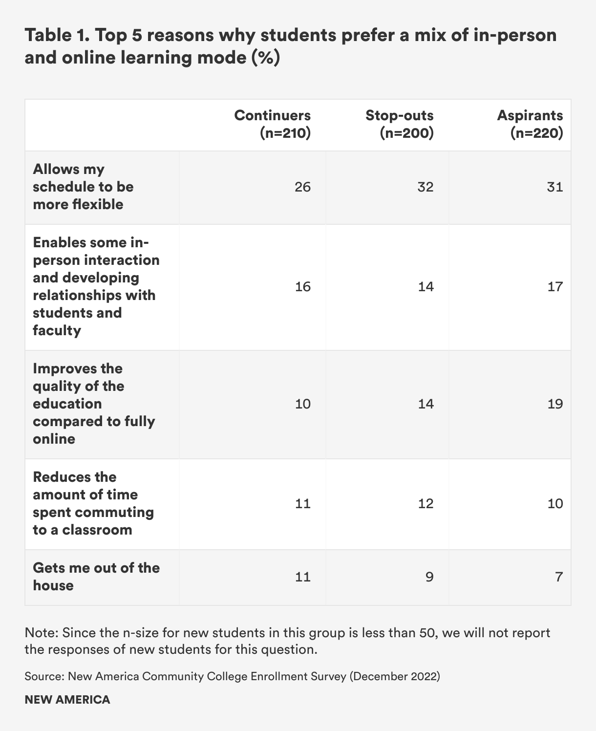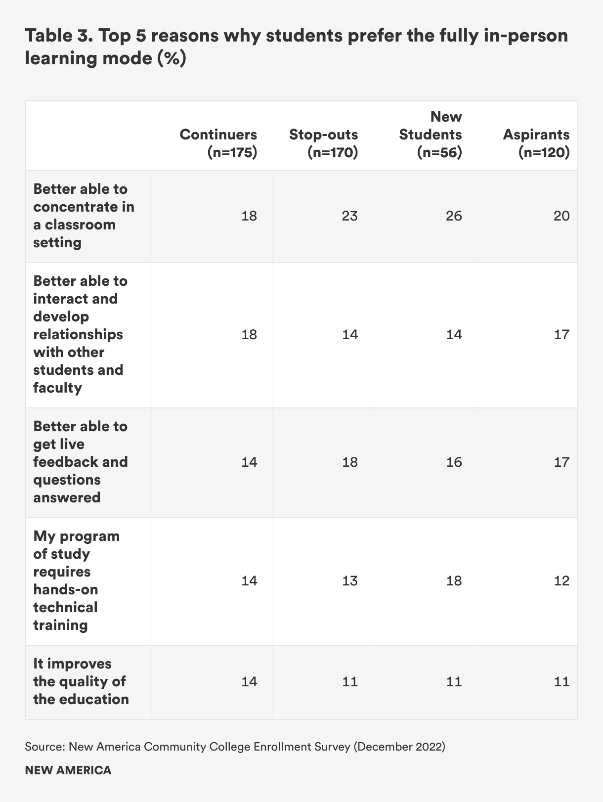 In contrast, students’ reasons for preferring the fully in-person mode have less to do with flexibility and more to do with concentration and relationship-building. Of those who said they prefer in-person learning, nearly 18 percent of continuers, 23 percent of stop-outs, 26 percent of new students, and 20 percent of aspirants said they find it easier to concentrate in the classroom setting. In addition, between 14 and 18 percent of respondents are motivated by the ability to interact and develop relationships with other students and faculty (See Table 3).
