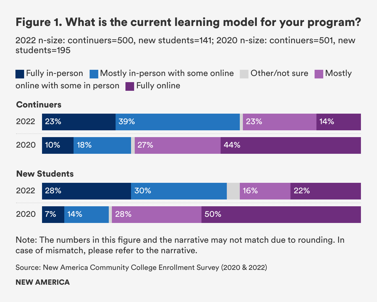The survey shows that in the fall of 2022, 37 percent of continuers (those who enrolled anytime between January 2021 and 2022 and continued to enroll in fall 2022) and 38 percent of new students (those who considered and actually enrolled in the following fall semester) enrolled in completely or mostly online programs. These numbers represent a significant drop from the early days of the pandemic when COVID-19 precautions established online learning as the norm for 71 percent of continuers and 78 percent of new students.[1] But while not as many students enrolled in online programs as two years ago, not many came back to fully in-person programs either: only 23 percent of continuers and 28 percent of new students were enrolled in fully in-person programs (See Figure 1).