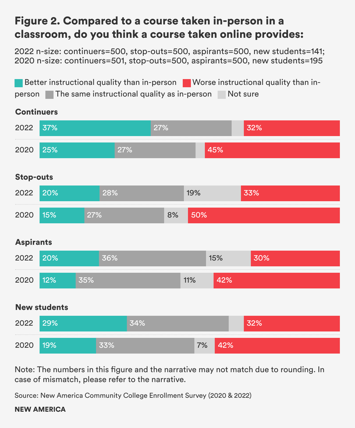 One top finding from this survey is that a lot more students think online courses provide better educational quality than in-person courses compared to two years ago. In 2020, only 25 percent of continuers and 19 percent of new students thought online courses were better quality; but now, 37 percent of continuers (a plurality) and 29 percent of new students believe online courses are better. Even among those who were not enrolled, opinions about the quality of online learning have also changed, though not quite to the level of continuing and new students. Only 15 percent of stop-outs (those who enrolled between spring 2021 and 2022 but stopped in fall 2022) and 12 percent of aspirants (those who considered enrolling but did not enroll in fall 2022) thought online courses were better in quality than in-person courses in 2020–two years later, the number has increased to 20 percent for both groups (See Figure 2).