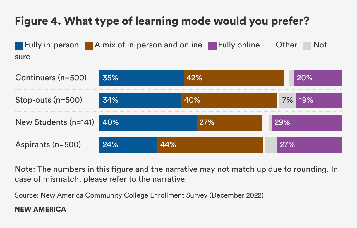 Students across all four enrollment groups prefer that at least some of their coursework continue to be remote. Nearly two in three continuers, 59 percent of stop-outs, 56 percent of new students, and 71 percent of aspirants prefer to either be partially or fully online. Having said that, a decent share of students still prefer to attend completely in person: 35 percent of continuers, 34 percent of stop-outs, 40 percent of new students, and 24 percent of aspirants (See Figure 4).