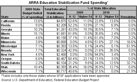 According to the applications filed with the Department of Education a few states have decided to focus most of their Education Stabilization spending in 2010 instead of 2009. New York, Maine, and Minnesota all plan to spend more than 50 percent of their Education Stabilization funds on K-12 in 2010. After South Dakota, these three states have the lowest budget deficits as a percent of overall state spending.