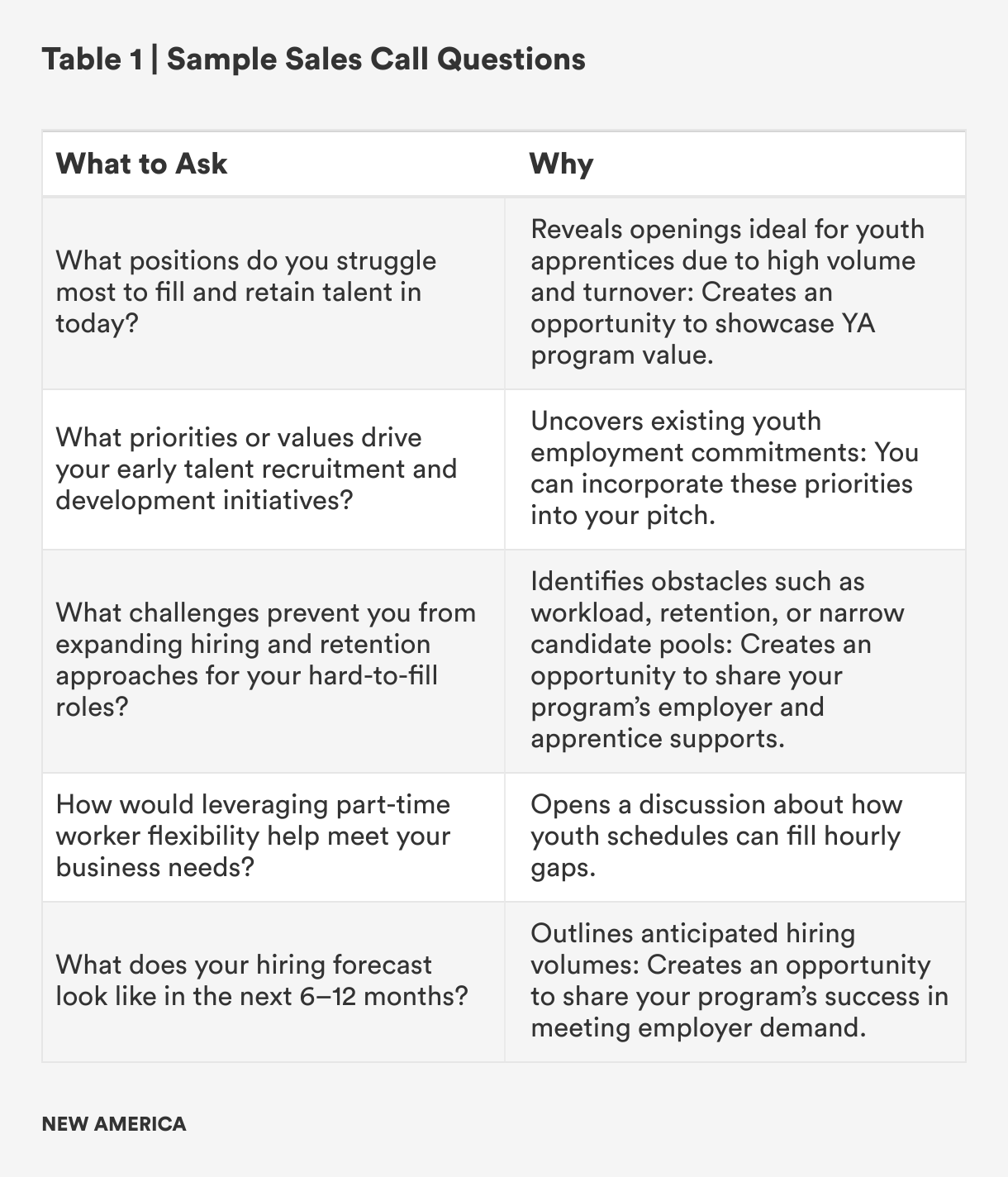 A sales call can be used to position youth apprenticeship as a valuable talent solution, but it’s also an opportunity to more clearly understand employers’ specific needs and motivations. Recruiters should come prepared with a list of questions (see Table 1) designed to get employers talking about their talent needs.