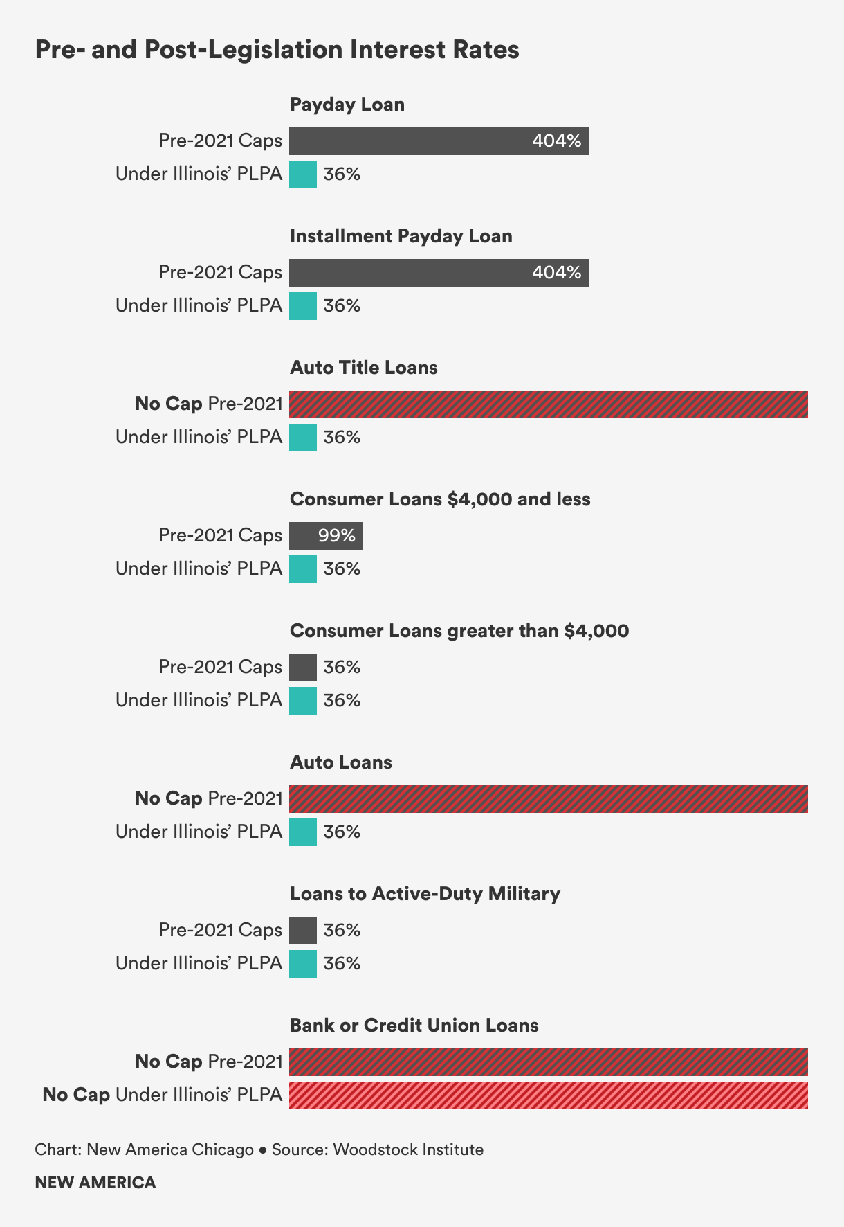 - Data made available from the Illinois Department of Financial and Professional Regulations only included two types of loans, payday and installment payday. Several other types exist and also have historically had very high average interest rates and in some cases no caps on interest rates.