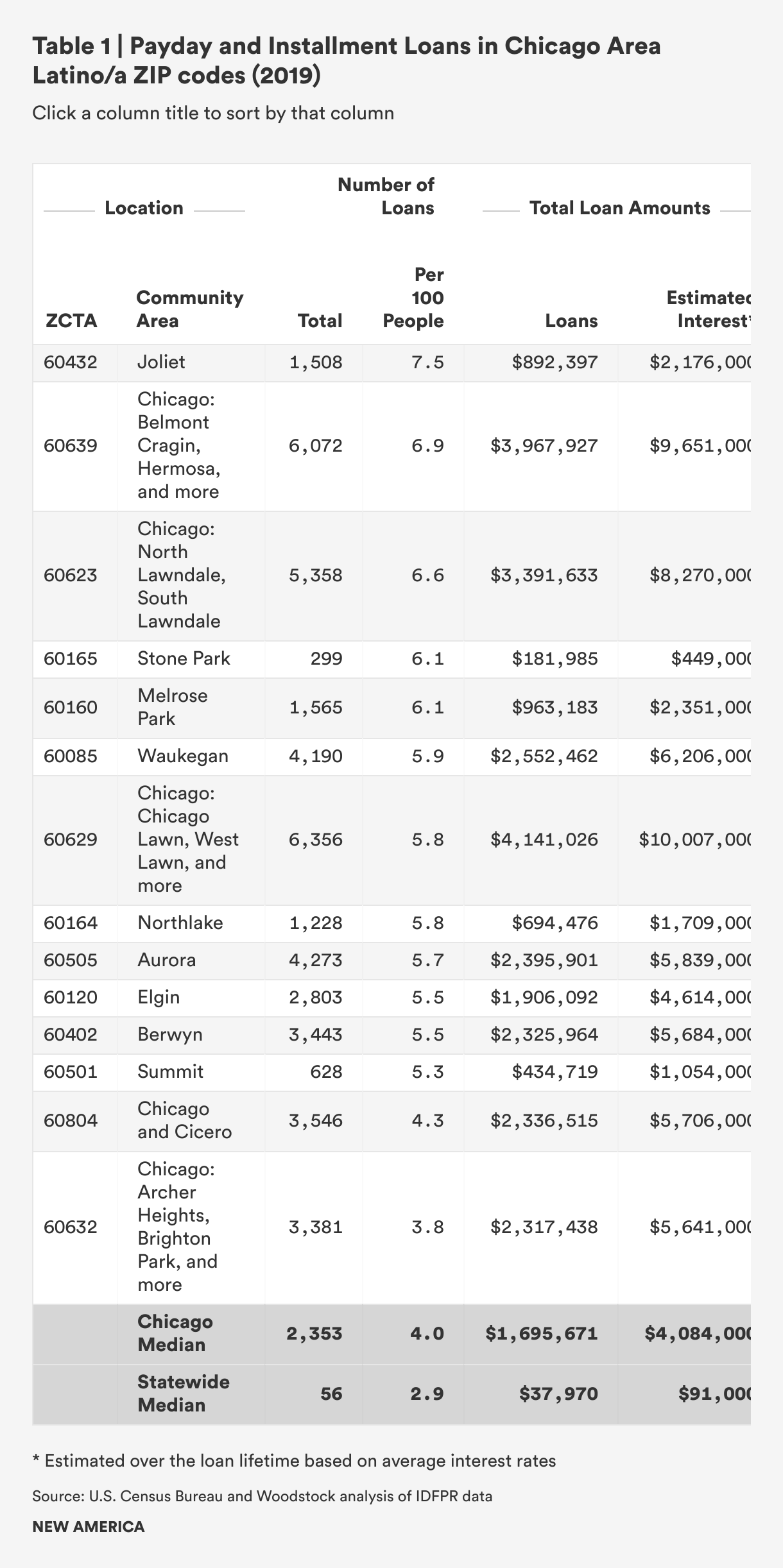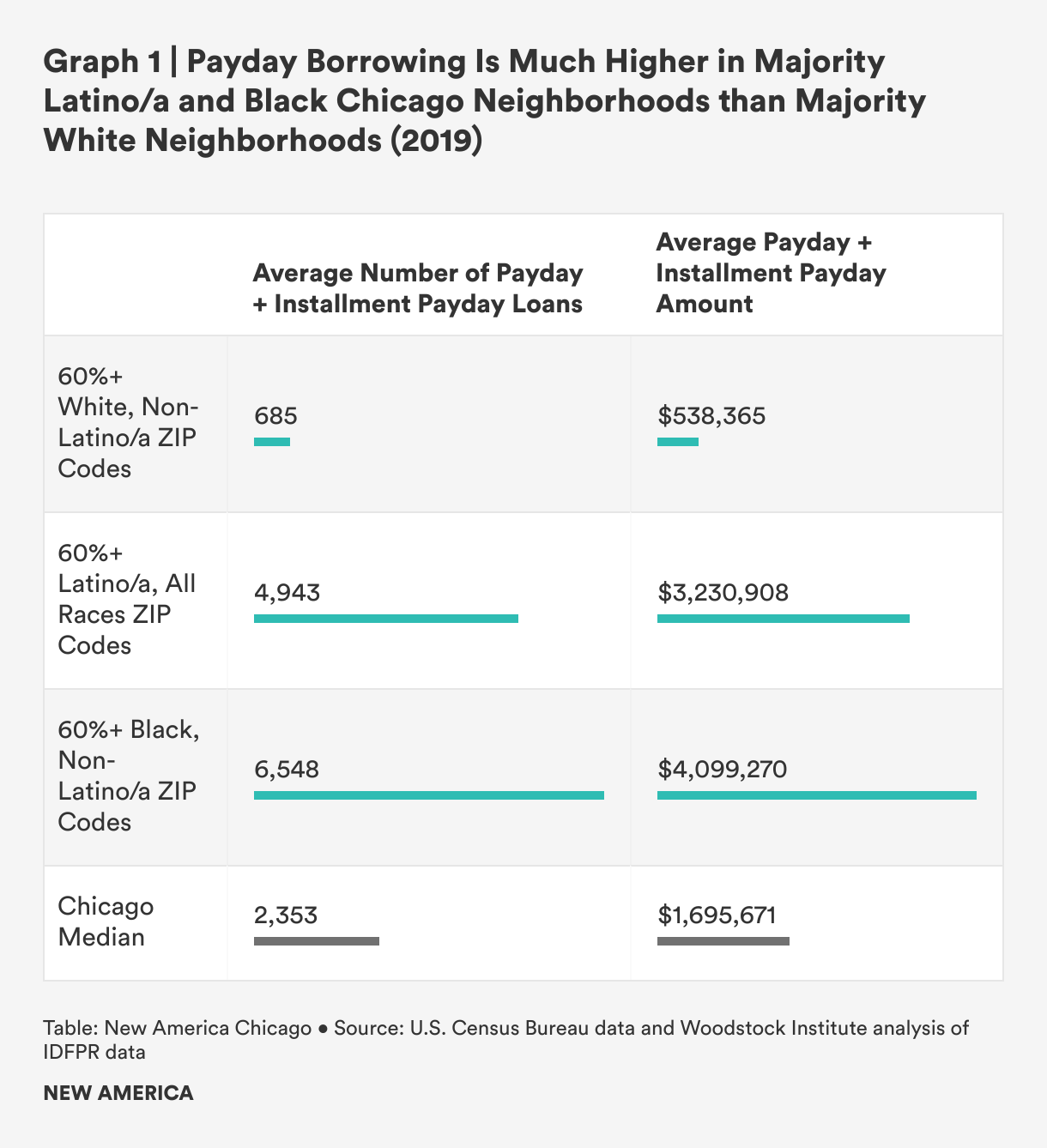 In just one year, people in highly concentrated Chicago Black and Latino/a ZIP codes borrowed $65.3 million in payday and installment payday loans. With average interest rates and fees equaling 299 percent for payday loans and 233 percent for installment loans, this means these 17 ZIP codes lost another $158.2 million in interest just from 2019 loans. Including majority Black and Latino/a communities across the city and suburbs, these communities paid $261.9 million in exorbitant interest rates for loans made in 2019.