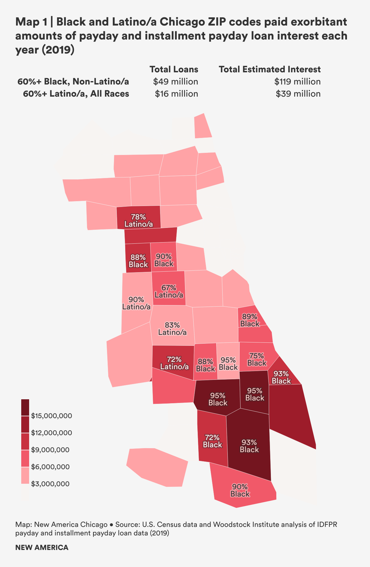 Over the years, predatory loans have taken a major financial toll in Black and Latino/a communities. In Chicago, payday and installment payday loans were almost ten times more common in majority Black ZIP codes and over seven times more common in majority Latino/a ZIP codes than in majority white ZIP codes.7 In just one year, 2019, people in majority Black and Latino/a city of Chicago ZIP codes paid over $158 million in exorbitant payday loan interest8 on $65 million in payday and installment payday loans.