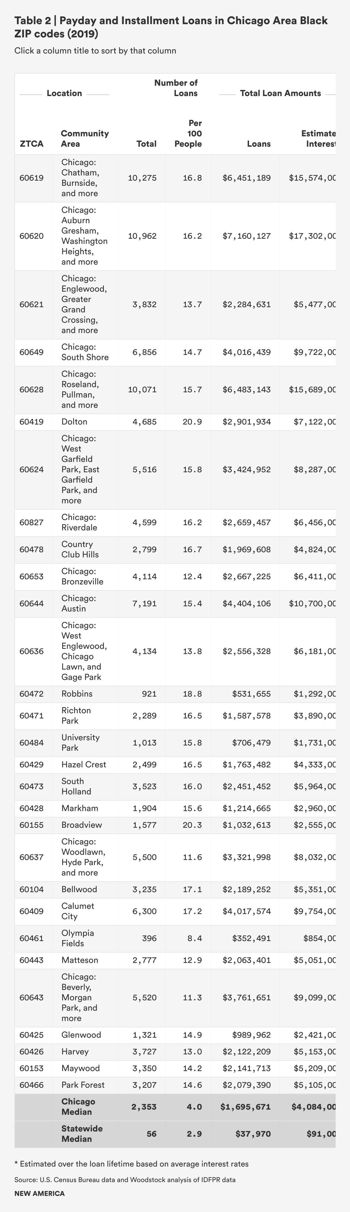 In the city of Chicago proper, payday and installment payday loans were highest in highly segregated Black ZIP codes. Looking at how common these loans are and taking population size into account, the seven ZIP codes in Chicago with the highest number of loans per person are all over 87 percent Black, with the exception of one ZIP code in the Loop. The highest number of payday loans per capita is found in 60619, which also has the highest percentage of Black residents in the city. The area includes Burnside and Chatham, among other neighborhoods, and has nearly 17 payday and installment payday loans per 100 people. Following close behind, 60620, which includes parts of Auburn Gresham and Washington Heights, among other neighborhoods, is second in per capita payday loans and is also over 95 percent Black. These two ZIP codes alone paid over $30 million in interest on just the payday loans made in one year. Yet both communities have median annual incomes between $37,000 to $39,000. In 60620, the interest paid would have consumed the average mortgage payments for an entire year for 1,300 families.