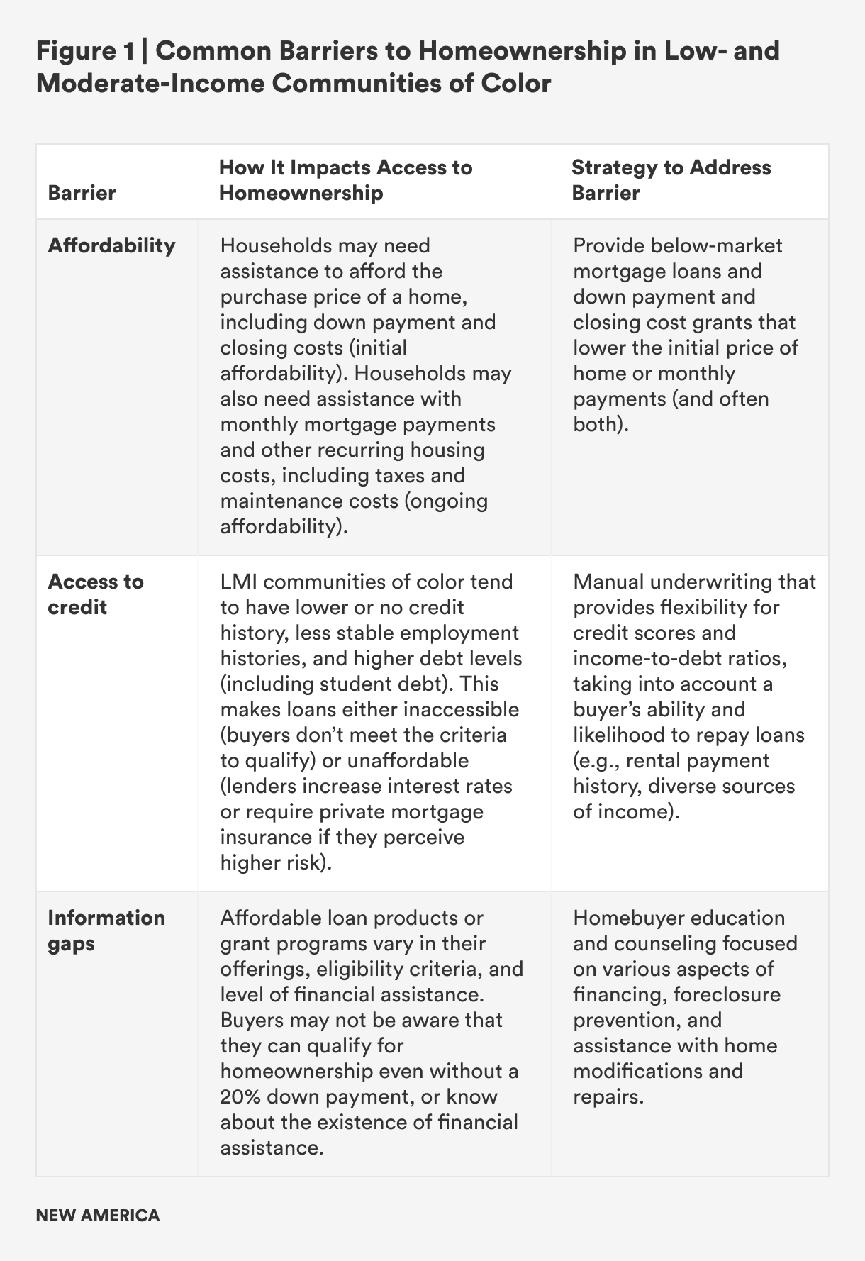 Barriers to homeownership in LMI communities of color fall into three broad categories: affordability, access to credit, and information gaps. As shown in Figure 1, there is a set of strategies that homeownership programs commonly use to address each barrier. These include subsidizing the cost of a home (to address affordability), ensuring flexible underwriting (to address access to credit), and requiring robust homeownership counseling and education (to address information gaps).