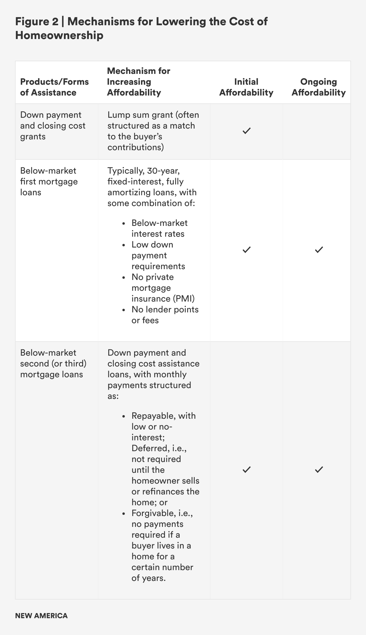 Figure 2 provides a high-level overview of the ways that programs’ typically lower the cost of homeownership, and whether these forms of assistance address initial affordability, ongoing affordability, or both. It is important to note that the products in Figure 2 are commonly layered to deepen levels of affordability.