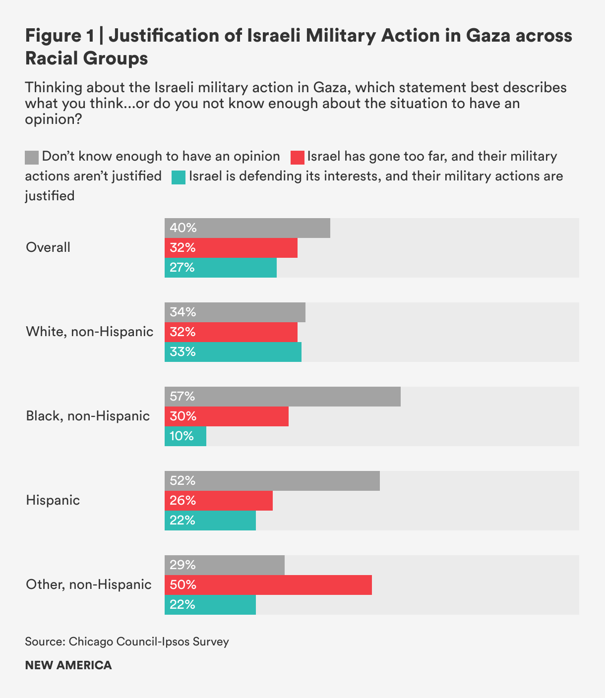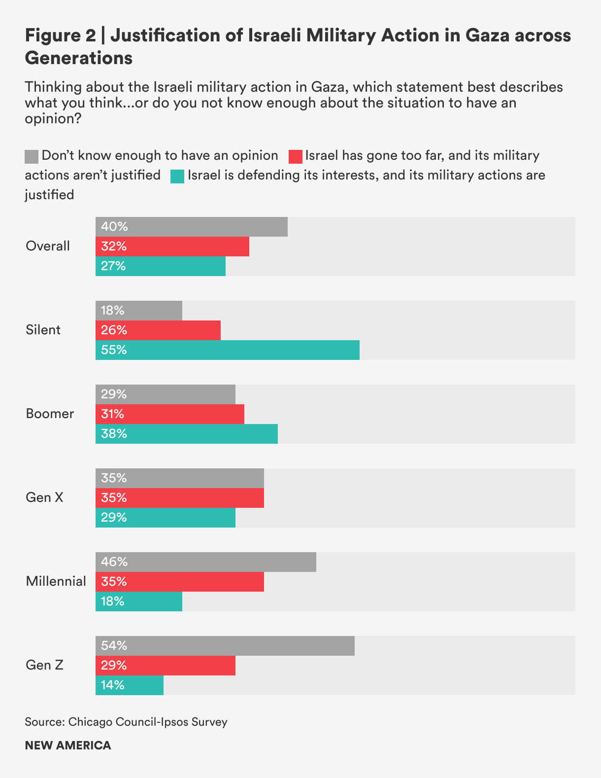 - Black, Hispanic, Millennial, and Generation Z Americans are the most likely to say they do not know enough about the situation to give their opinions. Among those who do, more say Israel has gone too far in its military operations than say it is justified in defending itself.