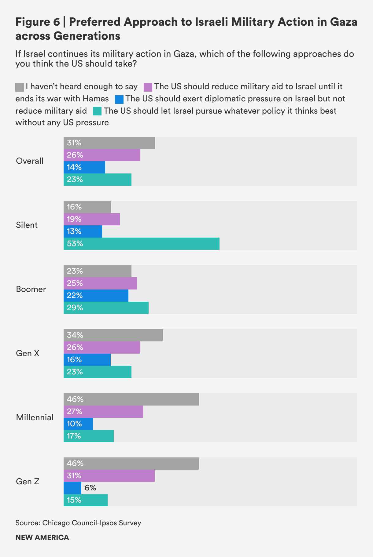 - Most Americans, with the exception of those from the Silent Generation, think the United States should apply some pressure on Israel if it continues its military operations in Gaza, either by reducing military aid or exerting diplomatic pressure.