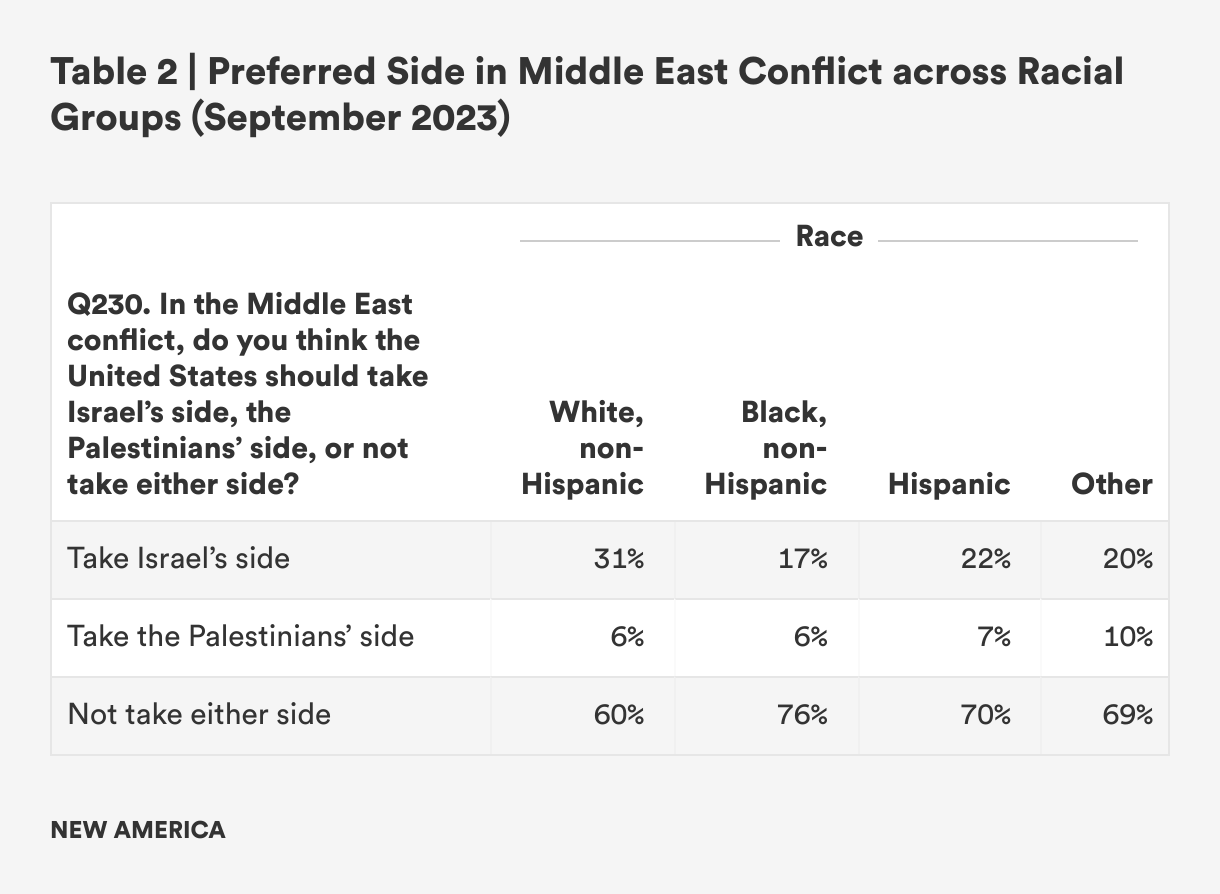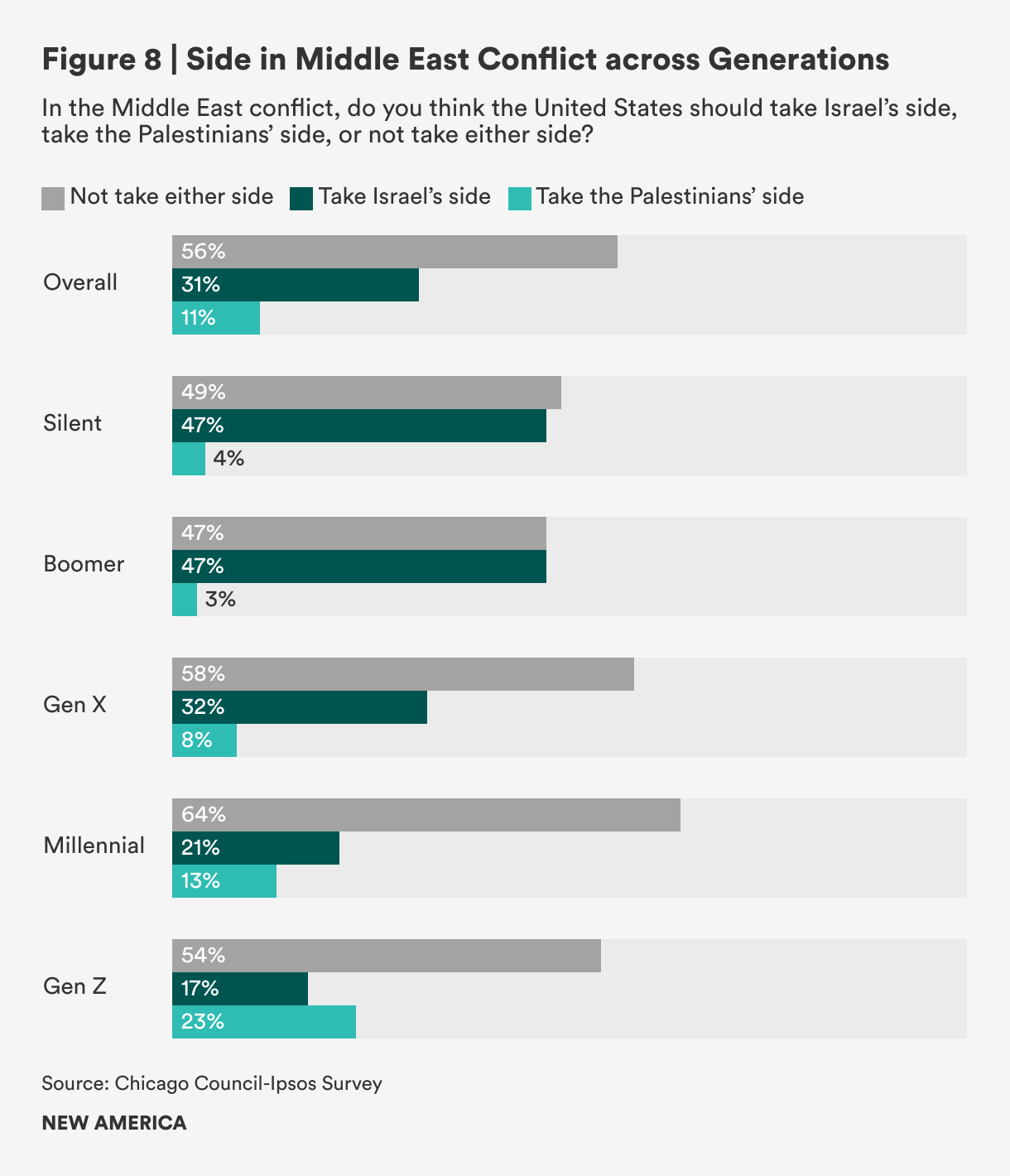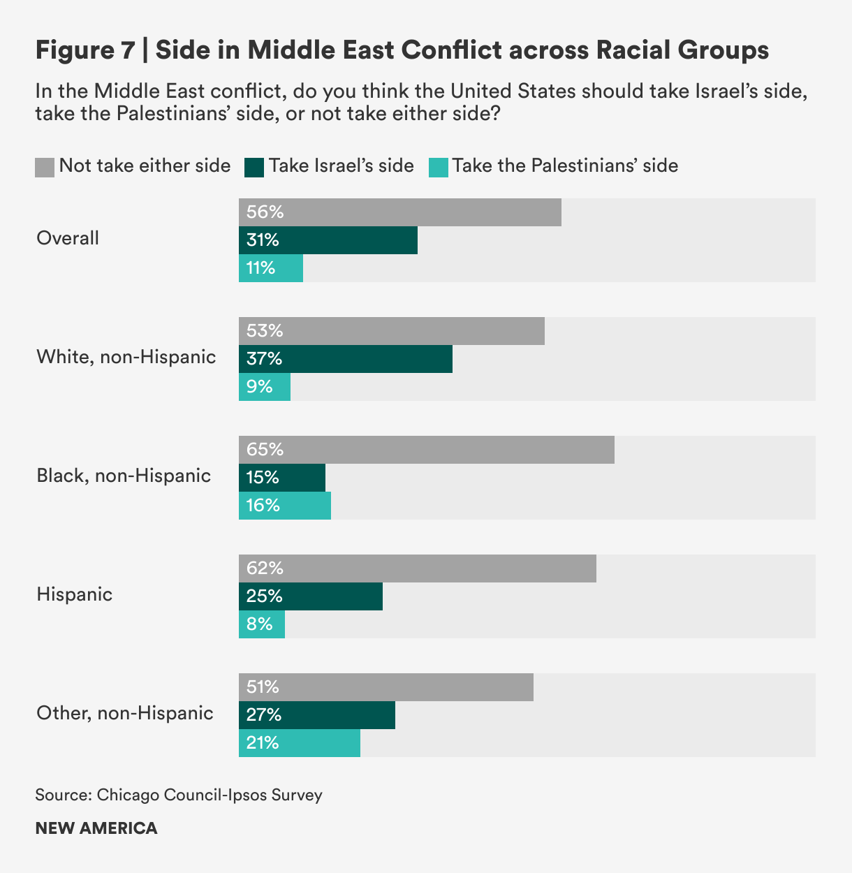 - Majorities across all racial groups prefer that the United States remain impartial in the Middle East conflict. Among the minority who think it should take a side, Black and Generation Z Americans think the United States should take the Palestinians’ side, while other racial and ethnic groups tend to side with Israel.