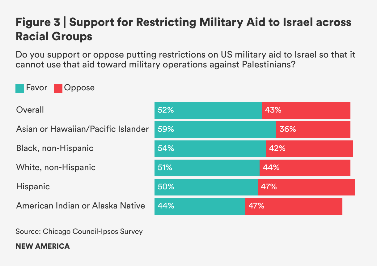 With the exception of Native Americans, Americans of all different races and ethnicities favored the United States placing restrictions on its military aid to Israel so it cannot use that aid toward military operations against the Palestinians. Asian, Hawaiian, or Pacific Islander (AAPI) Americans were the most likely to favor restricting military aid to Israel (59 percent), followed closely by Black Americans (54 percent). White and Hispanic Americans were more divided on whether to impose military aid restrictions on Israel, though bare majorities were in favor of restrictions (51 percent and 50 percent, respectively).