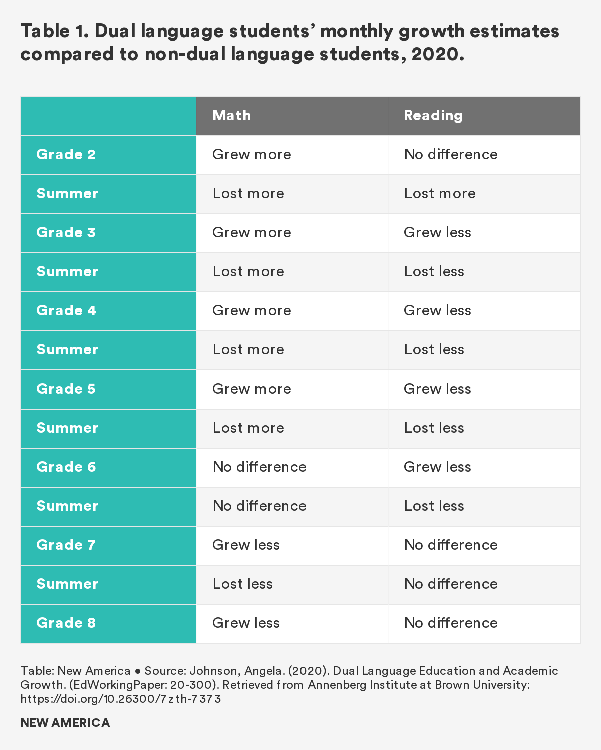 While previous studies have found resounding positive correlations between participation in dual language programs and academic achievement, Johnson’s study shows that students’ academic performance and associated needs are more nuanced when evaluated on a month-to-month basis. Focusing on these short-term academic gains and losses may allow schools to identify immediate learning loss before it hardens into a persistent opportunity gap.