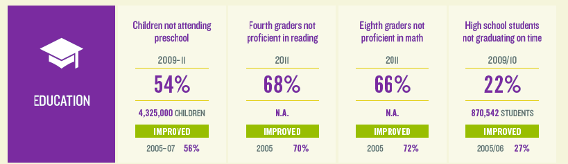 In each, children saw modest gains over previous years. As seen in the graphic below, 54 percent of children didn’t attend preschool, down slightly from 56 percent. Sixty-eight percent of fourth-graders were not proficient in reading, down from 70 percent, and 66 percent of eighth-graders were not proficient in math, down from 72 percent. In 2010, 22 percent of high schoolers didn’t graduate on time, down five points from the 2005-06 school year. Though the numbers themselves are still high, all four categories trended the right direction.