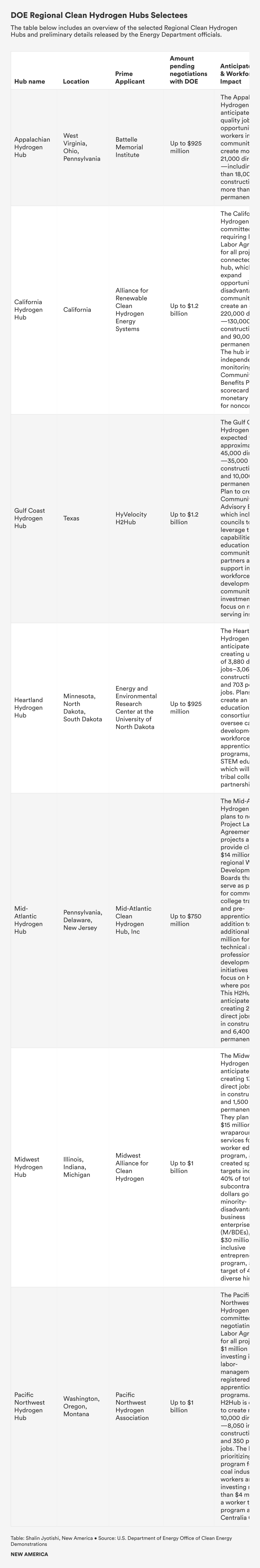 “Labor folks in particular have a lot riding on the hydrogen economy,” said Betony Jones, Director of DOE’s Office of Energy Jobs during the briefing, “it’s an opportunity to retain high-wage, union jobs as we transition to clean energy. These hubs represent a significant opportunity to build a whole new industry.”