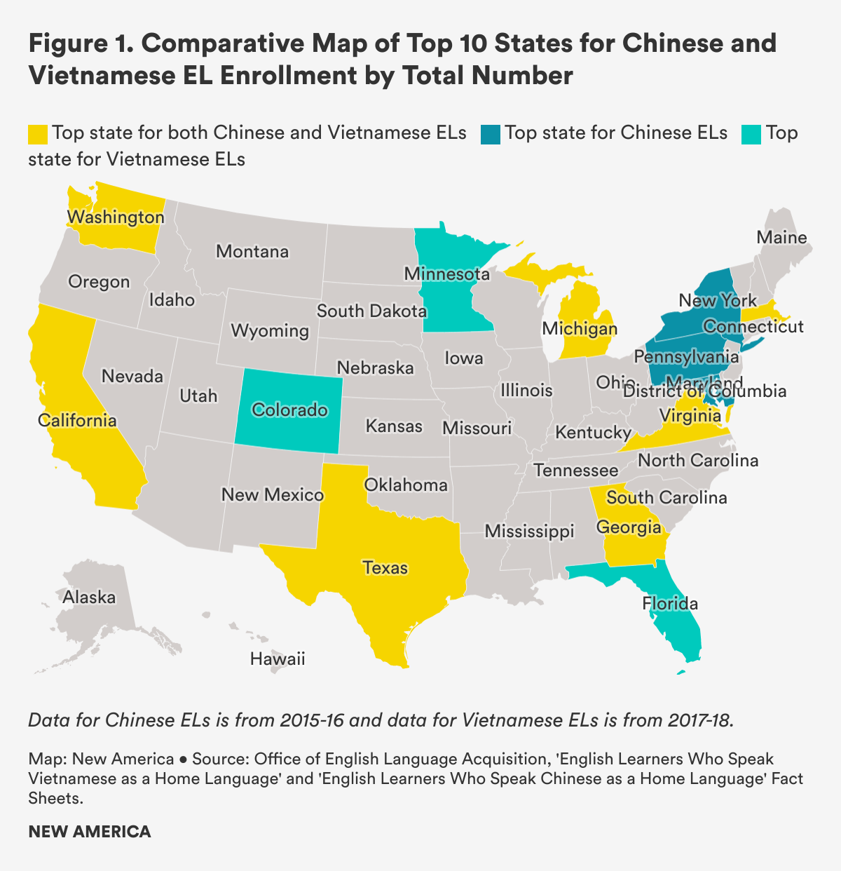In terms of where these students live, there is significant overlap between states that enroll a high number of Chinese and Vietnamese ELs (Figure 1). English learners from NHPI backgrounds are similarly concentrated in certain hubs around the country as over half of them are distributed across only 25 local education agencies (LEAs).