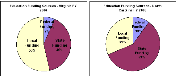 While federal funding disparities are significant, 90 percent of the funding schools receive comes from state and local sources. State policies determine both the amount and distribution of these funds, and are a major source of inequities. In Virginia, state funds provide a minimum foundation for education funding-40 percent-that each locality must match out of local funds. Localities can also choose to supplement school funding with additional local tax revenues. North Carolina, in contrast, uses a district funding formula based on student enrollment and cost of hiring teachers and staff that benefits wealthier districts and has no local matching requirement. As a result, local funding constitutes 31 percent of education funding in North Carolina and more than 53 percent in Virginia. Less flush districts like Cumberland County, N.C., are unable to supplement education spending as much as wealthier districts like Fairfax County, Va., and have no incentive to do so.