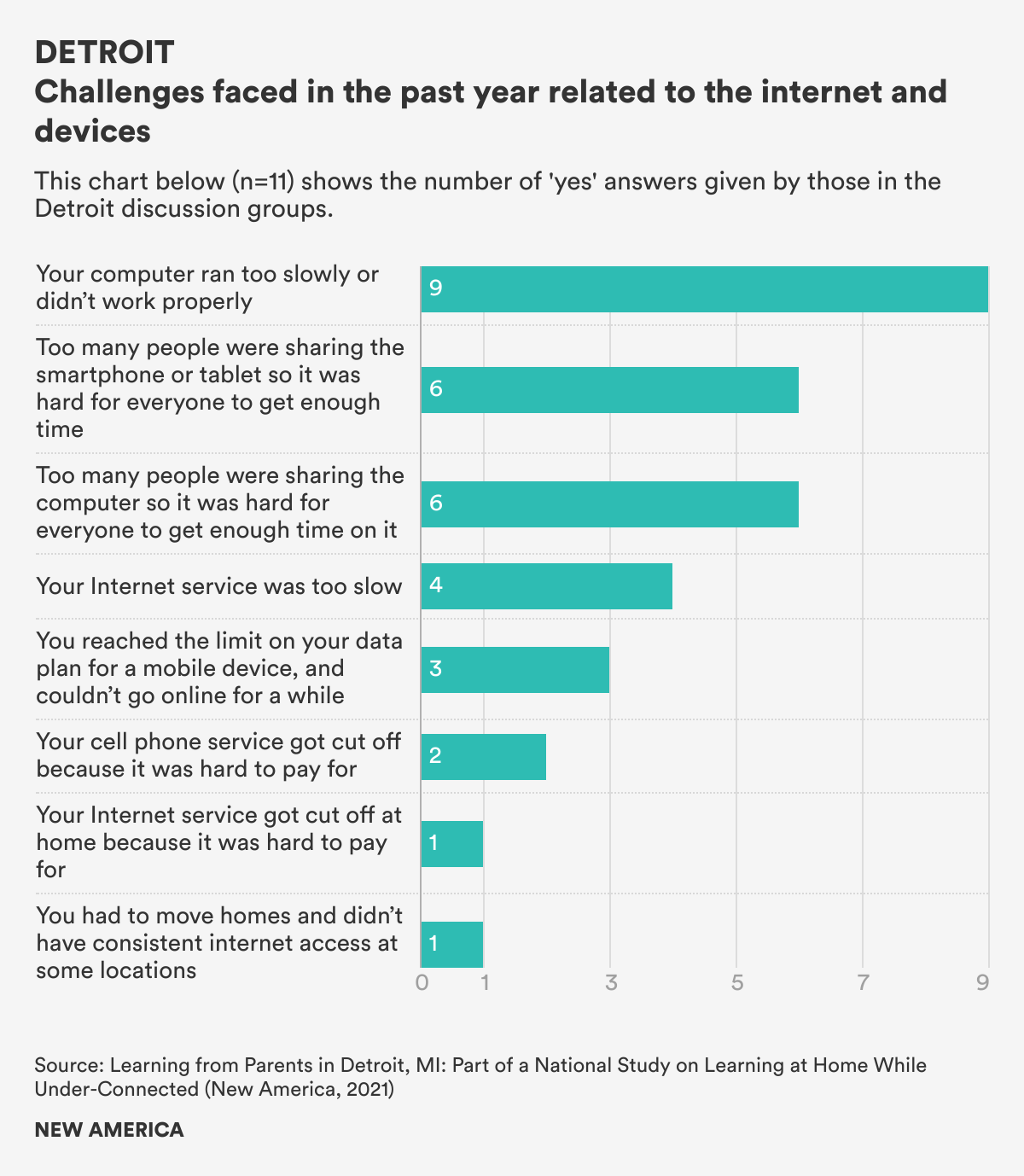 In April 2021, researchers in partnership with New America facilitated and recorded one-hour discussion groups with lower-income parents in three communities: Detroit, Pittsburgh, and Santa Clara County, CA. The focus was on parents and caregivers with young children, ages three to six, in households with incomes below $75,000 a year.[1] Discussion-group questions were designed to align with questions in a national probability-based telephone survey conducted in March and April 2021, Learning at Home While Under-Connected. These discussions enabled us to gather more in-depth and contextual information on what lower-income families have endured during the COVID-19 pandemic, what they need in terms of internet and device access, what they learned about their children’s learning while working with them at home over the year, what they want for their children in the coming school year, and more. This brief is a report of the responses from parents in Detroit. The full report and all three briefs are available here.