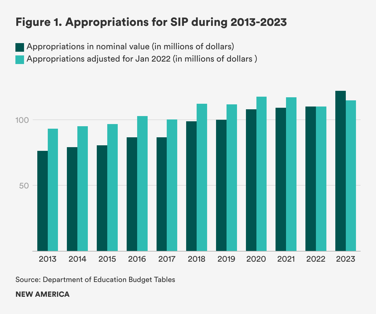 In FY 2023, Congress appropriated more than $122 million for SIP, making it the third-largest source of direct aid to colleges, after the programs that specifically focus on HBCUs and Hispanic-serving institutions. Funding for SIP has been pretty stable over the past 10 years. When taking inflation into account, appropriations for SIP increased by 23 percent between FY 2013 and 2023. The amount of funding dipped in 2022 but is almost back to pre-pandemic levels (see Figure 1).