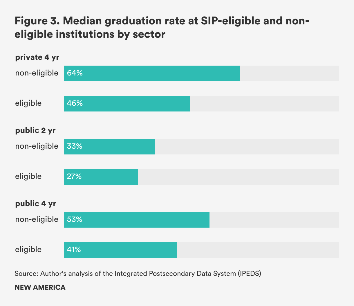 When considering outcomes, colleges eligible for SIP have considerably worse graduation rates than those ineligible for the program across all sectors. The biggest gap is among private four-year colleges, where 46 percent of students graduated within six years compared to two-thirds (64 percent) at better resourced institutions that do not qualify for the program. At public four-year universities eligible for SIP, about two in five (41 percent) students graduated within six years, compared to 53 percent at ineligible institutions. The differences are smaller at community colleges, where 27 percent of students at eligible schools graduated within three years, compared to one-third (33 percent) at ineligible schools (see Figure 3).