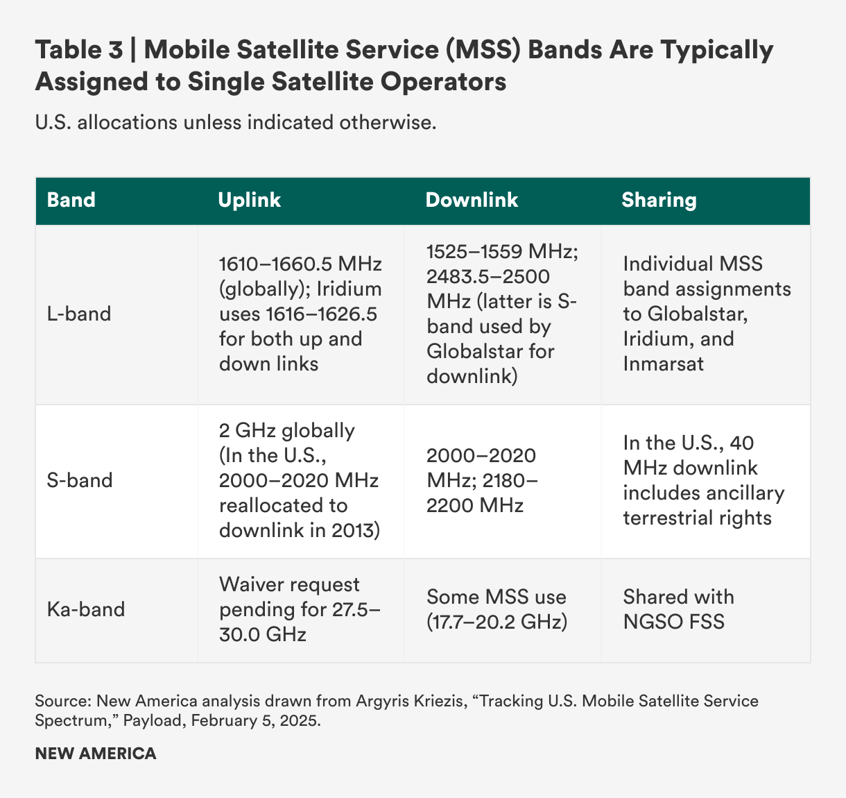 - Specifically, the 1.6/2.4 GHz bands are partitioned and exclusively occupied by Globalstar and Iridium. See Space Exploration Holdings LLC, Revision of the Commission’s 1.6/2.4 GHz “Big LEO” NGSO MSS Sharing Plan, Petition for Rulemaking, RM-11975 (filed Feb. 21, 2024). Prior to the commercial transaction, the 2 GHz band was exclusively allocated to EchoStar, with a modification authorizing ancillary terrestrial service. See Federal Communications Commission, Service Rules for Advanced Wireless Services in the 2000-2020 MHz and 2180-2200 MHz bands, Report and Order and Order of Proposed Modification, WT Docket No. 12-70, at paras. 6-15 (rel. Dec. 17, 2012). The 1.5 GHz band is held by Ligado, which is currently leasing the band to AST & Science, LLC. See Announcement of Settlement Term-Sheet by AST-Mobile, Securities and Exchange Commission, Ex. 99.1 (filed Jan. 6, 2025), source">source.