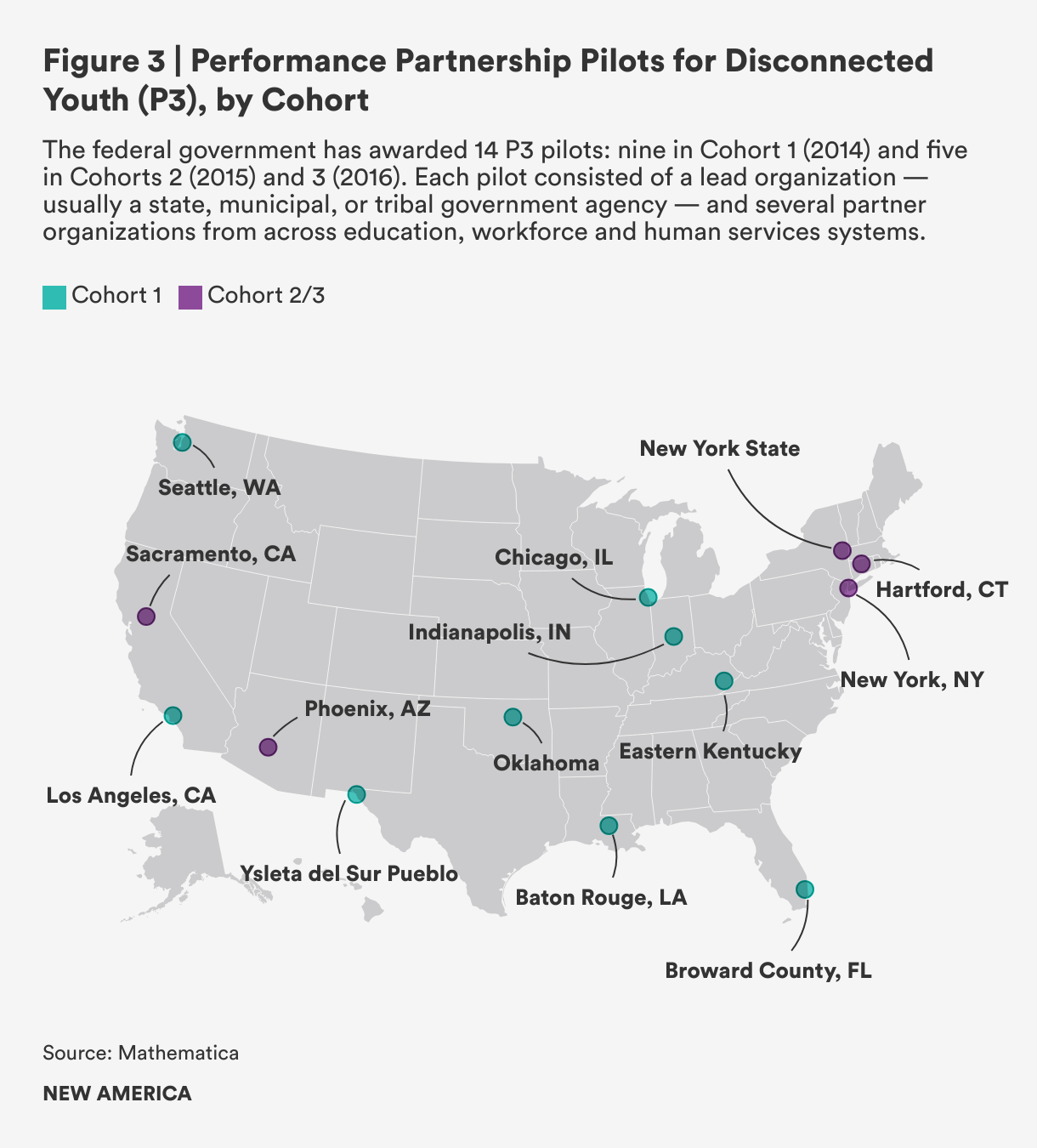 To date, the federal government has awarded 14 P3 pilots: nine in Cohort 1 (2014) and five in Cohorts 2 (2015) and 3 (2016). Each pilot consisted of a lead organization — usually a state, municipal, or tribal government agency — and several partner organizations from across education, workforce and human services systems.