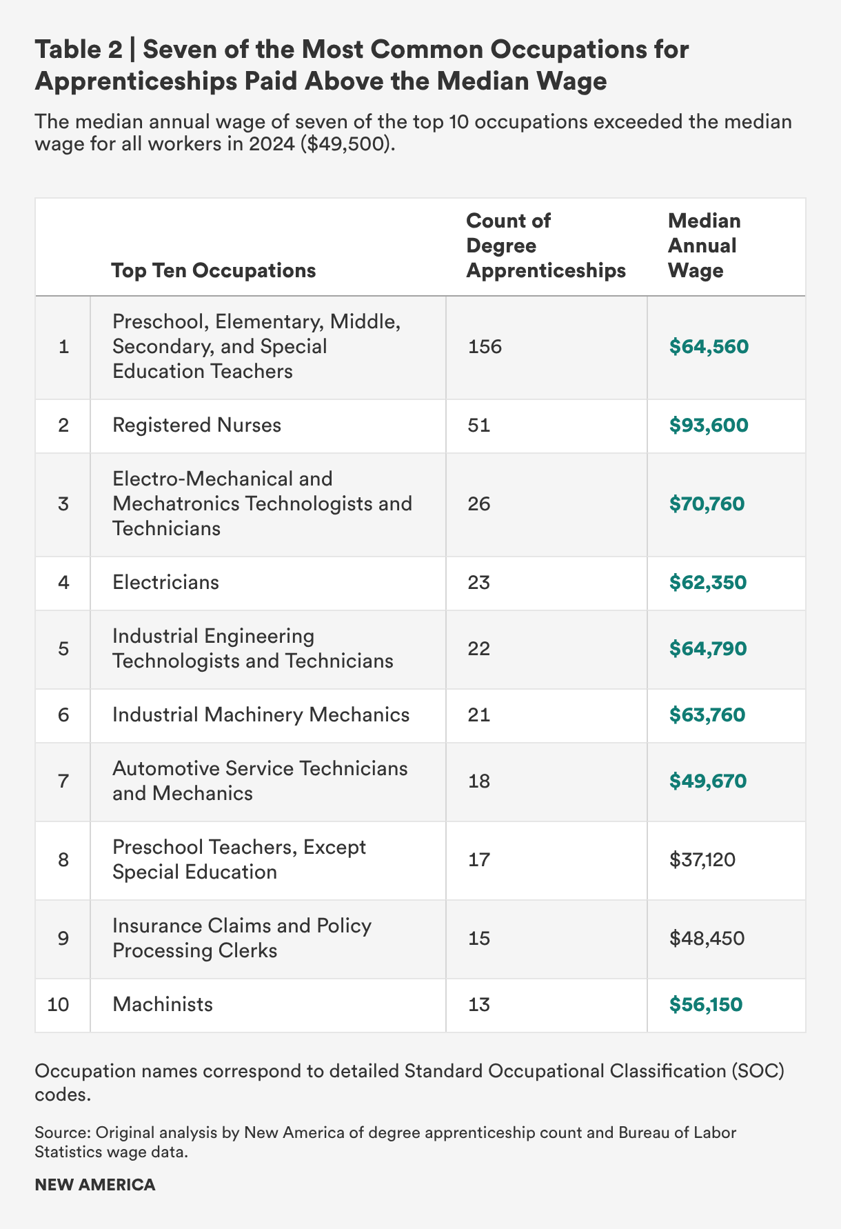 For the most part, degree apprenticeships are opening doors to well-paying jobs. As indicated in Table 2, the median annual wage of seven of the top 10 occupations exceeded the median wage for all workers in 2024 ($49,500). Of the occupations for which we identified degree apprenticeship opportunities, 86 percent paid more than the 2024 median annual wage. Software developer was the highest paying occupation ($133,080), while K–12 teaching assistant paid the least ($35,240).17