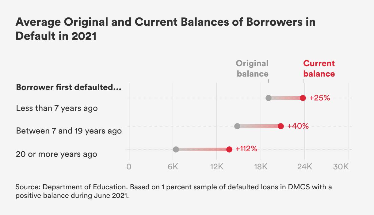 As a result, the average balance of a borrower in default and in the Department’s data has increased over the life of the loan to about $21,000, or $5,500 more than the average original balance. The growth is even more striking for extremely long-term defaulters: current balances are more than double the original principal among those in default who first defaulted twenty or more years ago.