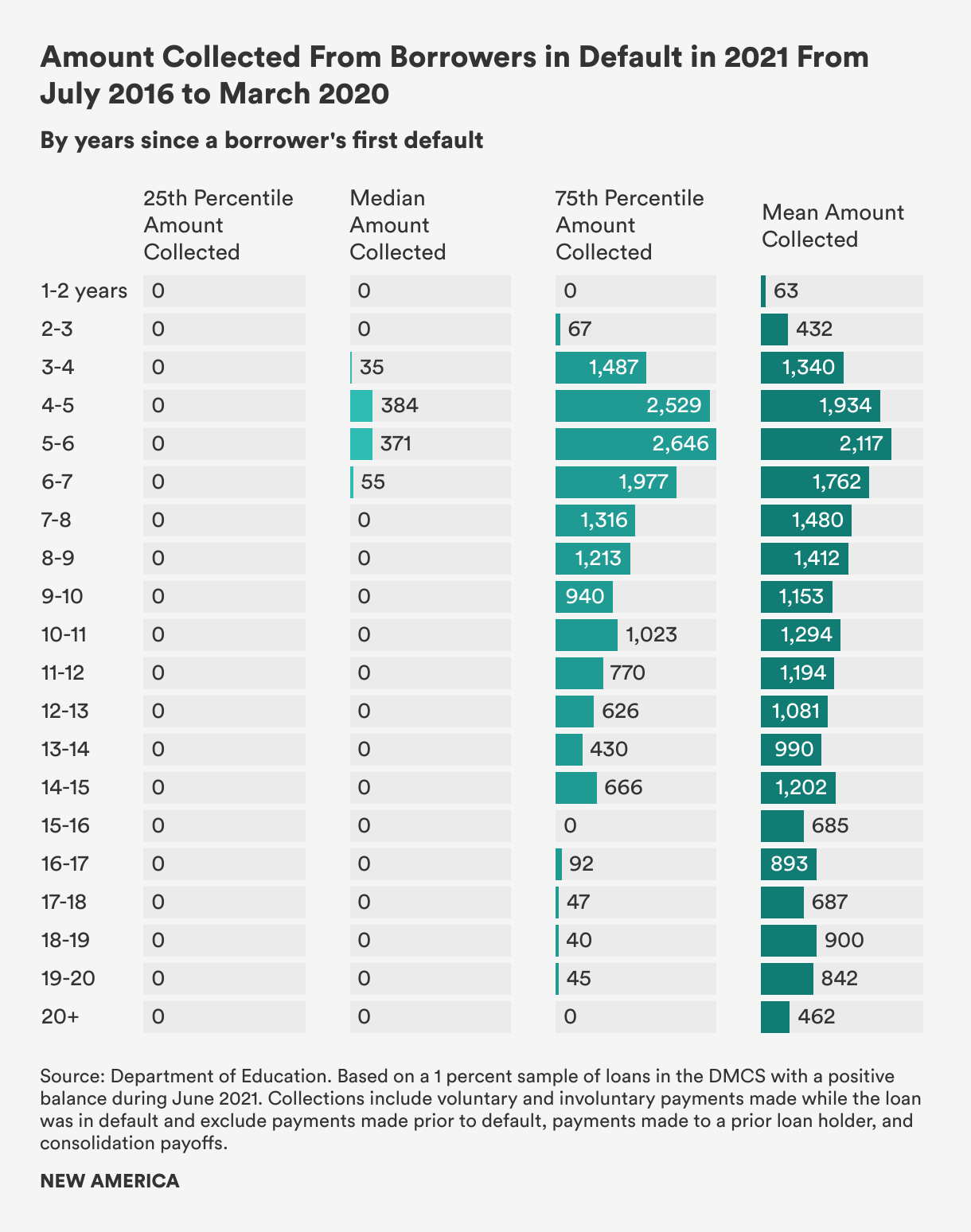 While borrowers are in default, the government has the authority to garnish wages, reclaim tax refunds, and take portions of Social Security payments. Although the Department estimates it recoups more than 75 percent of the balances of loans that enter default, little is recovered from most borrowers in long-term default. Over the three and a half years between July 2016 and March 2020, the default system collected nothing—including through both voluntary payments and involuntary collections—from the typical borrower who first defaulted seven or more years ago and is included in the Department’s data. Collections become even less fruitful as time in default extends beyond seven years. The default system recouped less than $100 from 75 percent of borrowers who first defaulted at least 15 years ago.