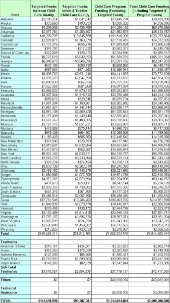 HHS has released guidance and state allocations for $2 billion in Child Care and Development Fund funds appropriated under the American Recovery and Reinvestment Act. Guidance at the link above, state allocations after the jump.