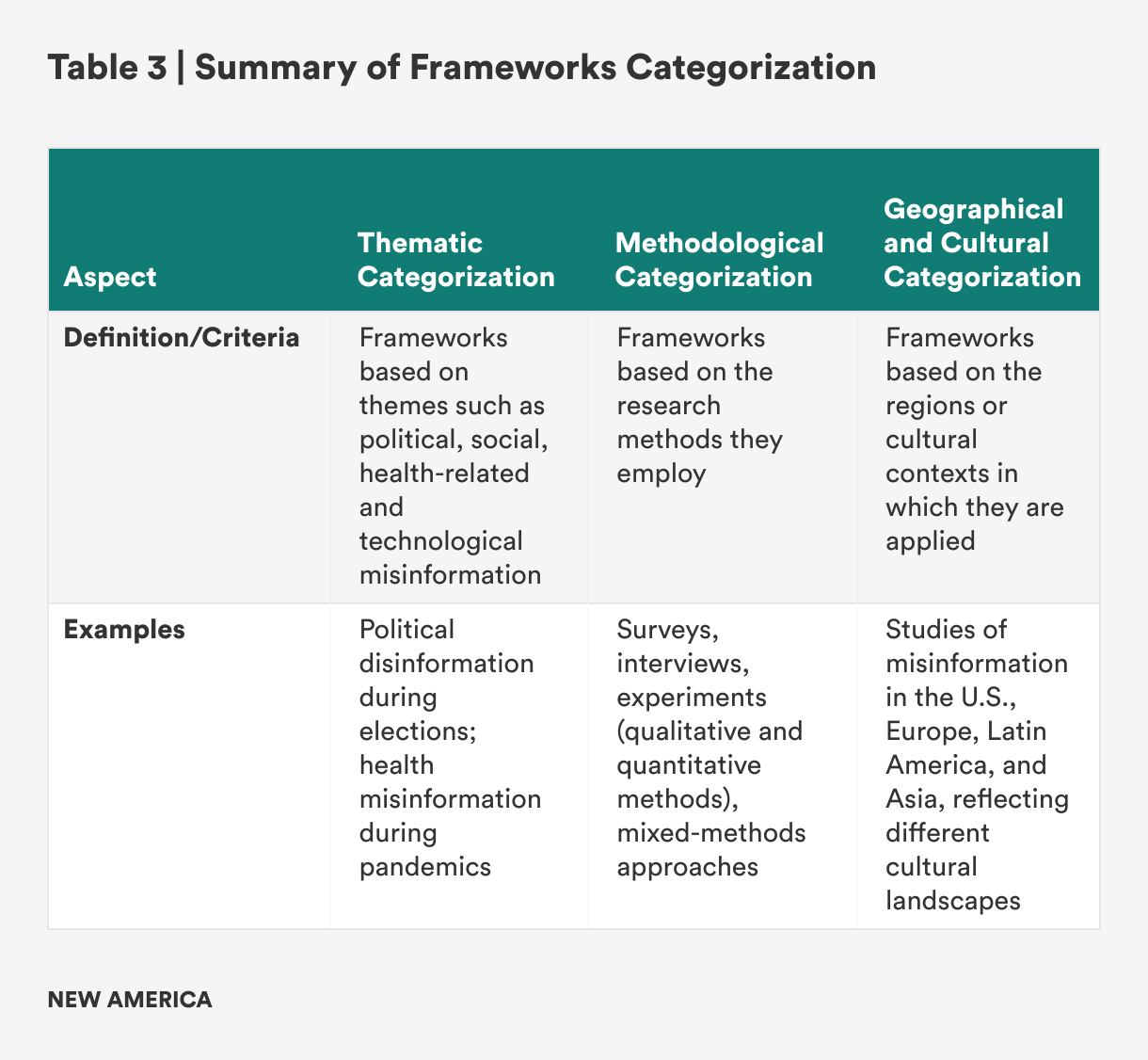 The diverse array of frameworks for understanding misinformation and disinformation can be overwhelming due to the various perspectives and methodologies they encompass. In this chapter, we divide the existing frameworks into thematic, methodological, and geographical or cultural considerations. Practically, when frameworks are categorized by themes, methods, or regional contexts, the focus is on tailoring research approaches and interventions to specific settings or problems. This is in contrast to the previous chapter, where frameworks were grouped into actor, process, impact, and typology categories and examined based on what aspect of misinformation and disinformation they target.