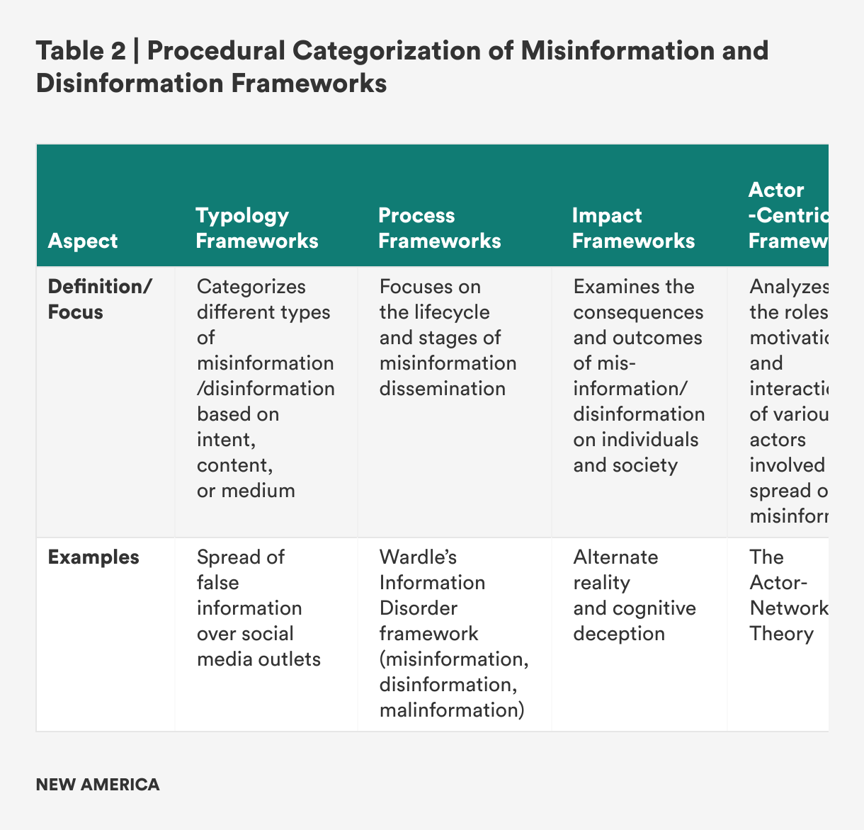 Finally, actor-centric frameworks offer a broad scope by considering the wide range of players involved in the creation, dissemination, and consumption of misinformation, as well as the complex relationships between them. By focusing on the motivations and behaviors of key actors, actor-centric frameworks can reveal the underlying drivers of misinformation. However, the inherent complexity of actor-centric frameworks can make them challenging to apply. The interactions between various actors are often intricate and not easily discernible, especially when motivations are hidden or intentionally obscured. This complexity requires significant resources and expertise to untangle, making actor-centric frameworks more difficult to implement effectively compared to other frameworks that focus on more straightforward aspects of misinformation.