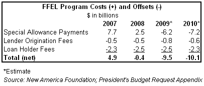 Now, where do the lenders come up with the $9 billion figure above? The government uses borrower payments to cover the costs of the interest it guarantees the lender under the Special Allowance Payment. But because the Special Allowance Payment rate fluctuates and the borrower rate is fixed, sometimes the borrower rate is more than enough to cover the rate the government guarantees the lender and other times it is not. In 2007 and 2008 the borrower rate was not enough, so the federal government paid lenders $7.7 billion and $2.5 billion respectively. This year it is estimated that borrower interest payments will more than cover the rate guaranteed lenders, leaving some $6.2 billion left over. Add in other fees lenders pay the government and the total comes to $9.5 billion.