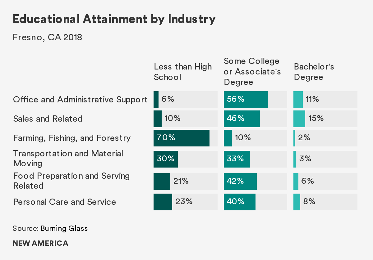 A key question for policymakers and employers during the recovery from this crisis is what good jobs will be created to replace the jobs lost, especially those that do not require an advanced degree to earn a family-sustaining wage. How can we set up vulnerable workers to be best suited for the changing economy in places like Fresno county, where only 15% of sales workers and 8% of food service workers have a Bachelor's degree?
