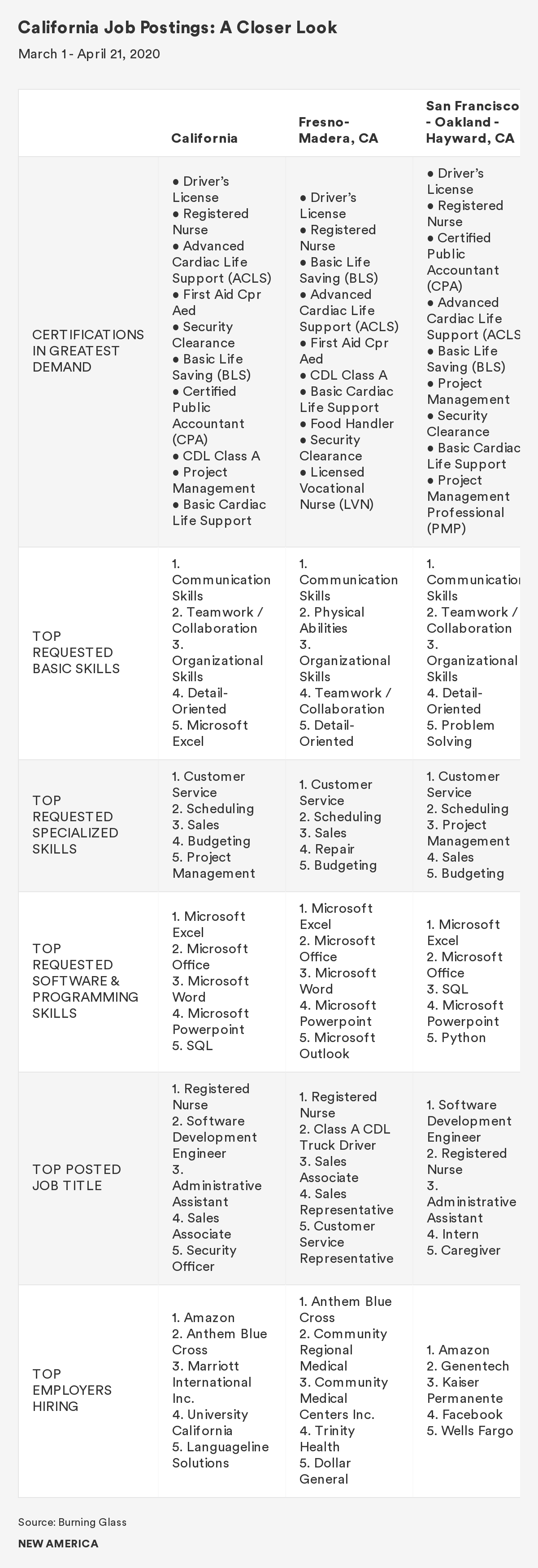 With the recent upheaval in the labor market, supporting flexible learning to help workers adapt is more important than ever. The ability to acquire new qualifications and in-demand skills is one way to strengthen resilience to economic shocks and help connect workers to stable, resilient job opportunities. It is also likely that many Americans are better prepared for an unconventional career shift than they know. In Fresno, San Francisco, and the state of California, Microsoft Excel, Customer Service, and Communication Skills were the top three skills requested in March and April 2020.